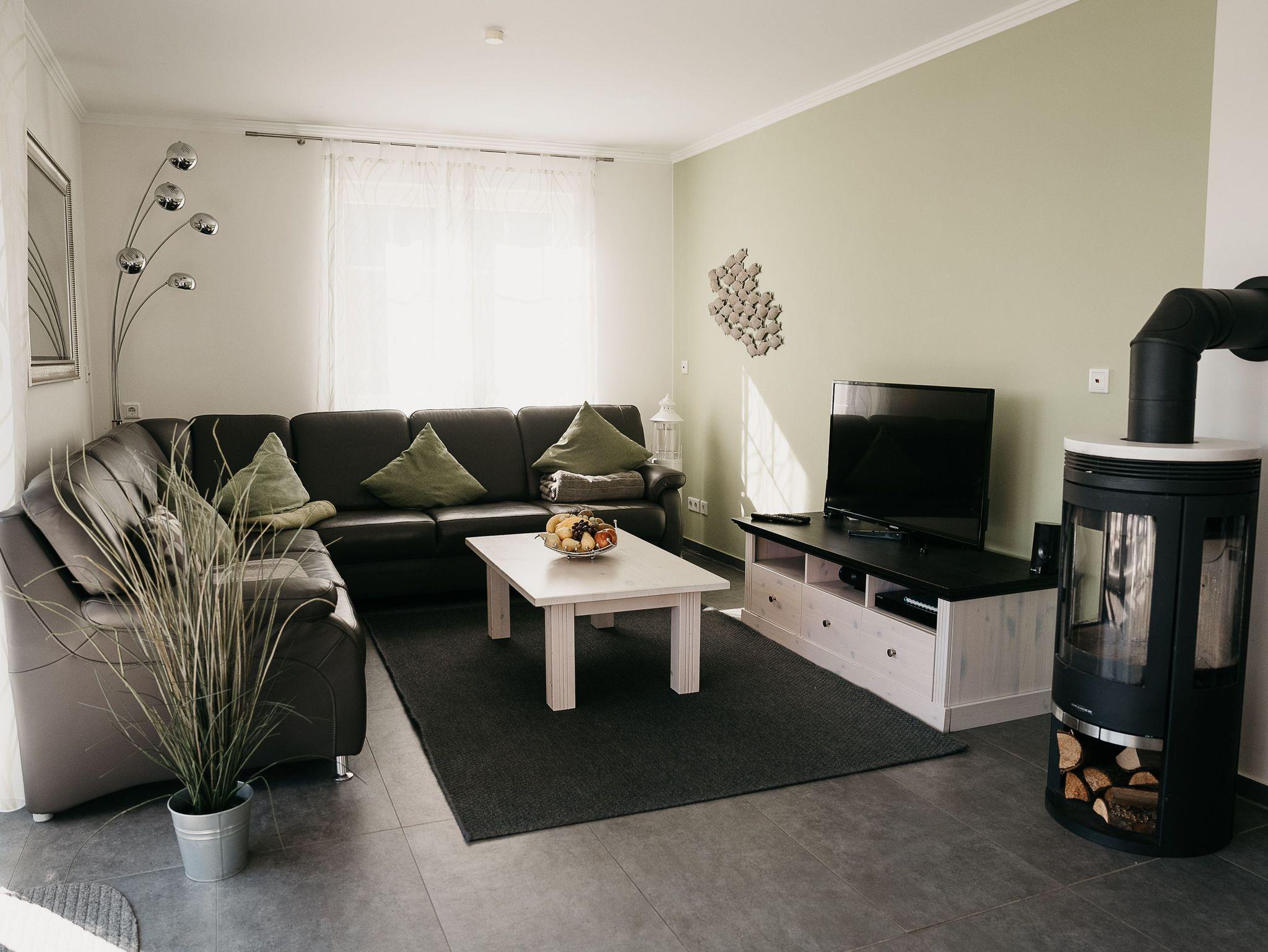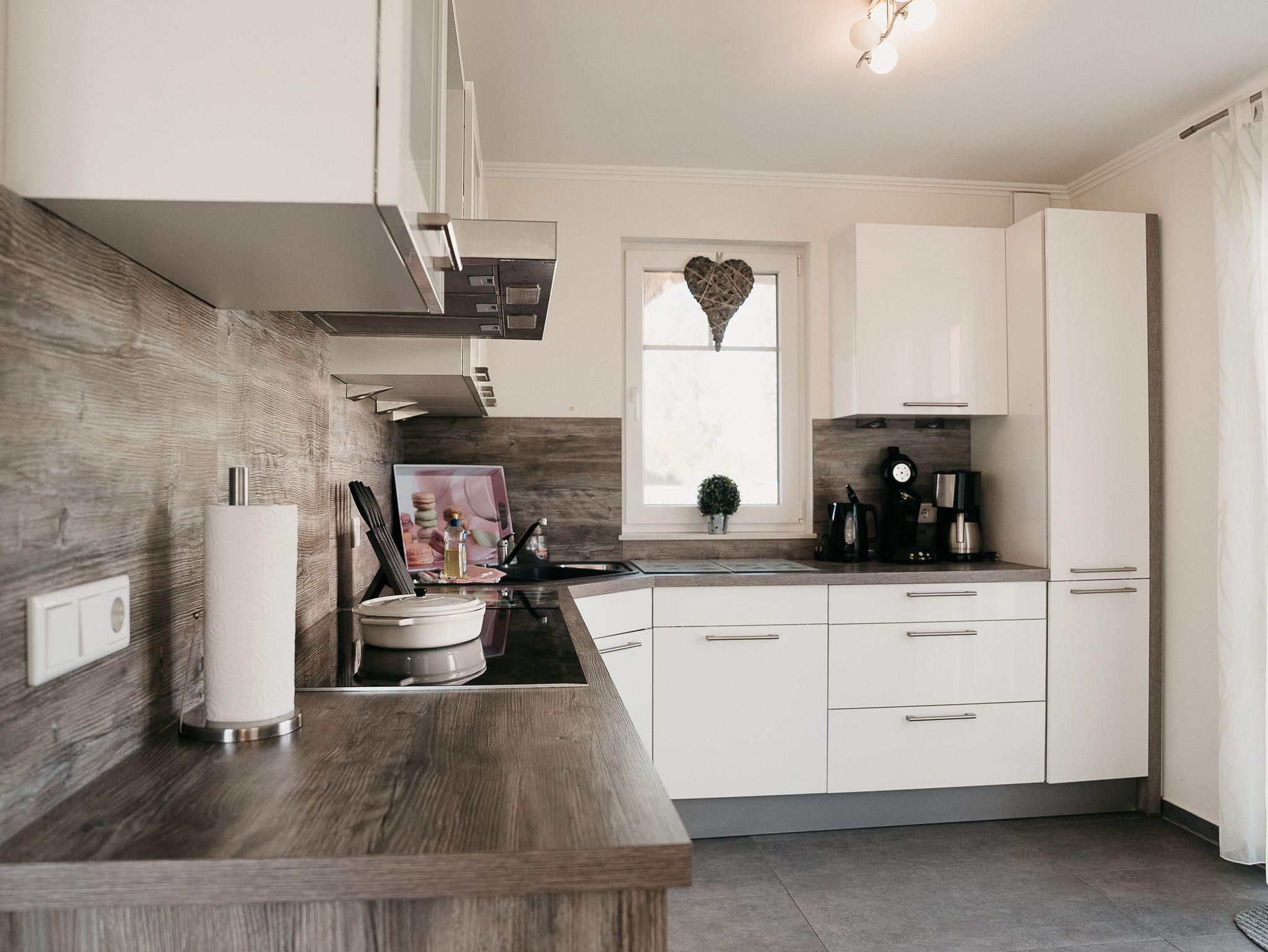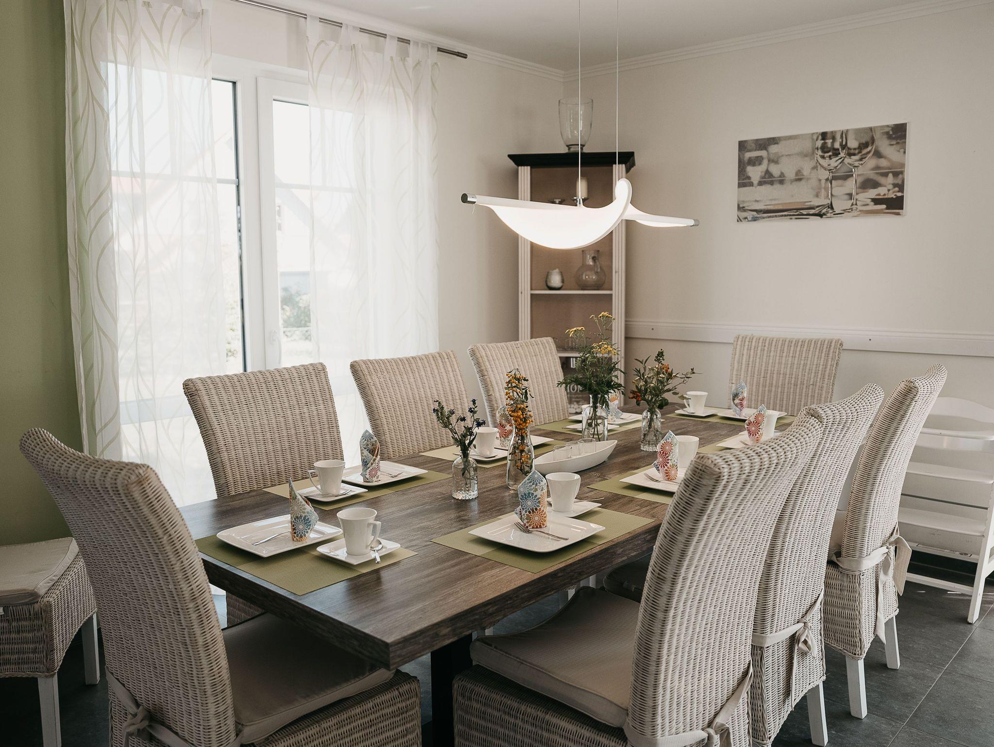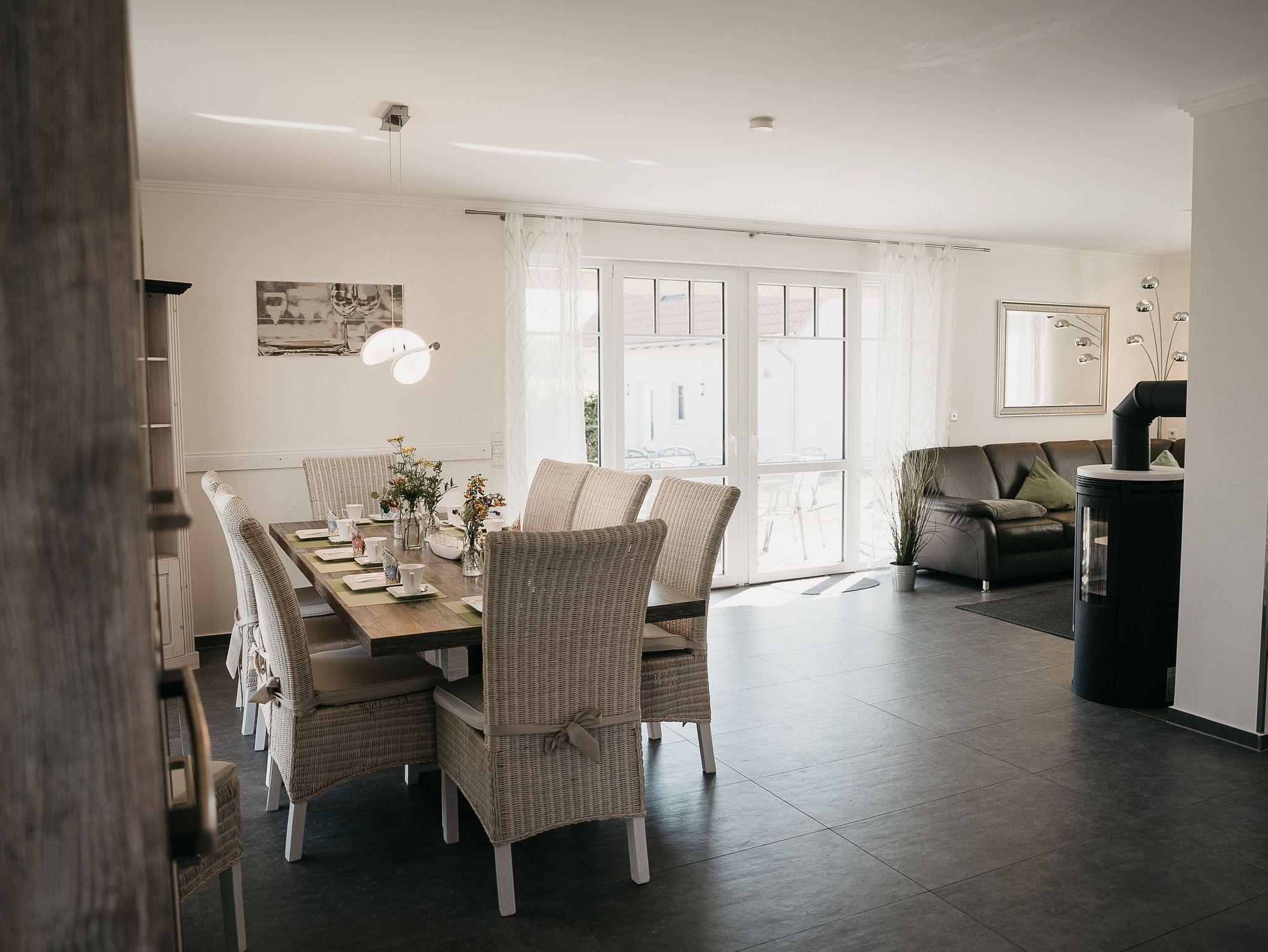 Im Erdgeschoss befindet sich ein großes Wohn-/Essezimmer mit einer gemütlichen Lederecke, Kaminofen und einem großen Esstisch für 10 Personen. Für unsere kleinen Gäste steht ein Kinderhochstuhl und Reisebett bereit. Die vollausgestattete Einbauküche, diese lädt zum gemeinsamen kochen ein. Sie bietet Ihnen einen großen Kühlschrank mit Eisfach, Induktionskochfeld, Dunstabzugshaube, hochgestellten Backofen, Spülmaschine, Mikrowelle etc., zusätzlich steht Ihnen eine Waschmaschine zur freien Verfügung.