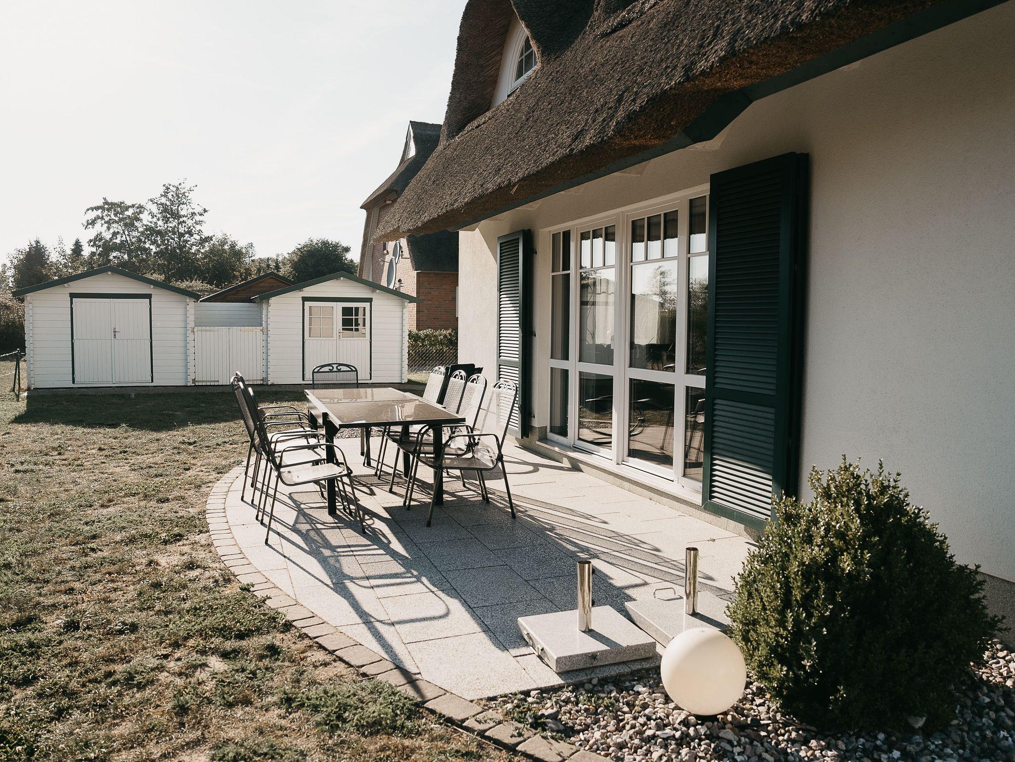 Die Außenanlagen sind durch eine Natursteinmauer / Zaun auf einer Höhe von ca. 80 cm eingezäunt. Zu Ihren Stellplätzen fahren Sie durch ein Doppelflügelgartentor, hier ist eine Stelfläche für bis zu vier Fahrzeuge. Alles was man so am Strand benötigt sowie Ihre Fahrräder können Sie im eigenen Fahrradschuppen verschließen. Vom Wohn- / Essenzimmer gelangen Sie auf die große Terrasse. Der große Gartentisch mit Platz für 10 Personen lädt zu einem geselligen Grillabend ein ( ein Elektrogrill steht im Fahrradschuppen zur Verfügung).