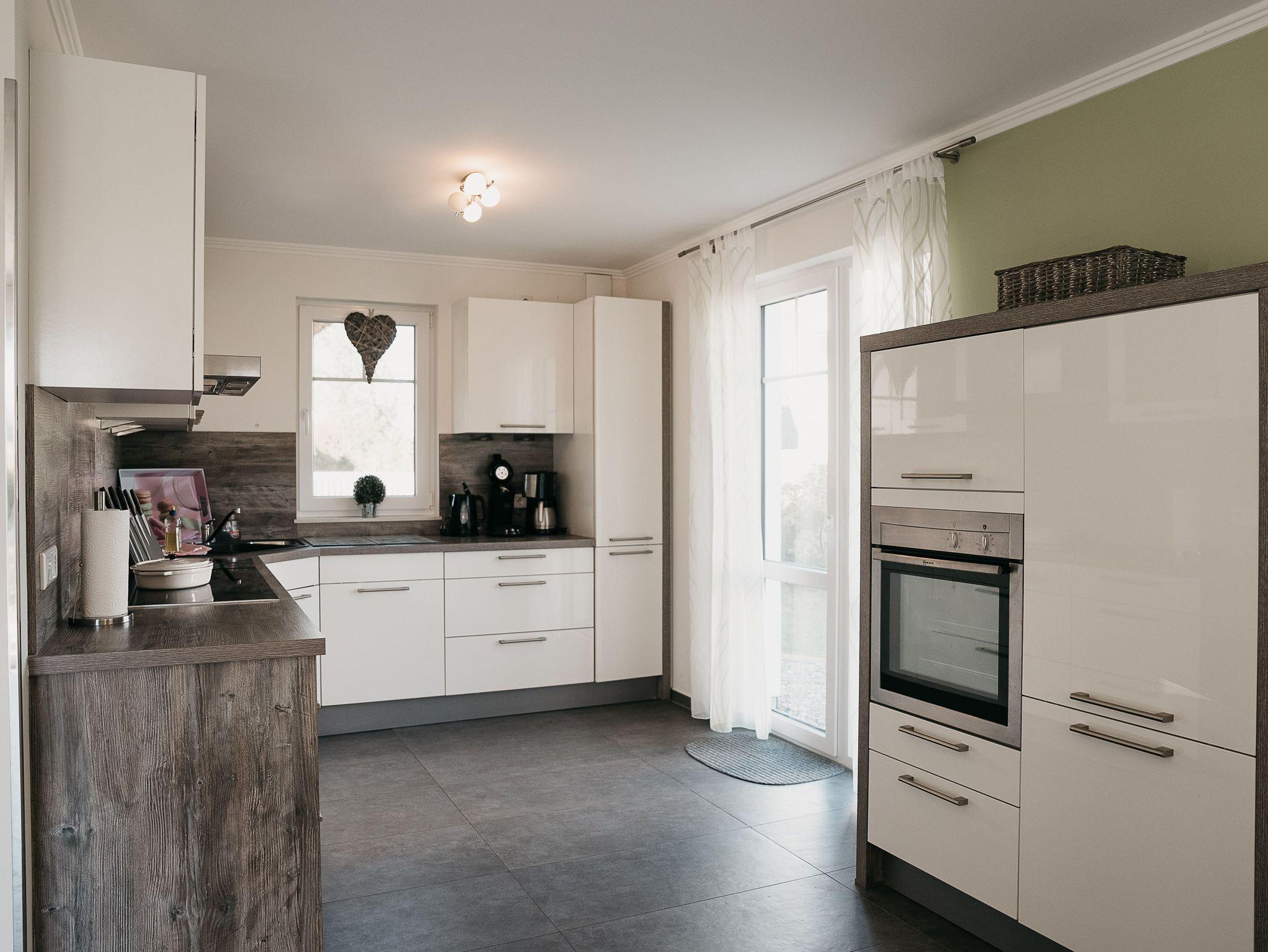 Im Erdgeschoss befindet sich ein großes Wohn-/Essezimmer mit einer gemütlichen Lederecke, Kaminofen und einem großen Esstisch für 10 Personen. Für unsere kleinen Gäste steht ein Kinderhochstuhl bereit. Die vollausgestattete Einbauküche, diese lädt zum gemeinsamen kochen ein. Sie bietet Ihnen einen großen Kühlschrank mit Eisfach, Induktionskochfeld, Dunstabzugshaube, hochgestellten Backofen, Spülmaschine, Mikrowelle etc., zusätzlich steht Ihnen eine Waschmaschine zur freien Verfügung.