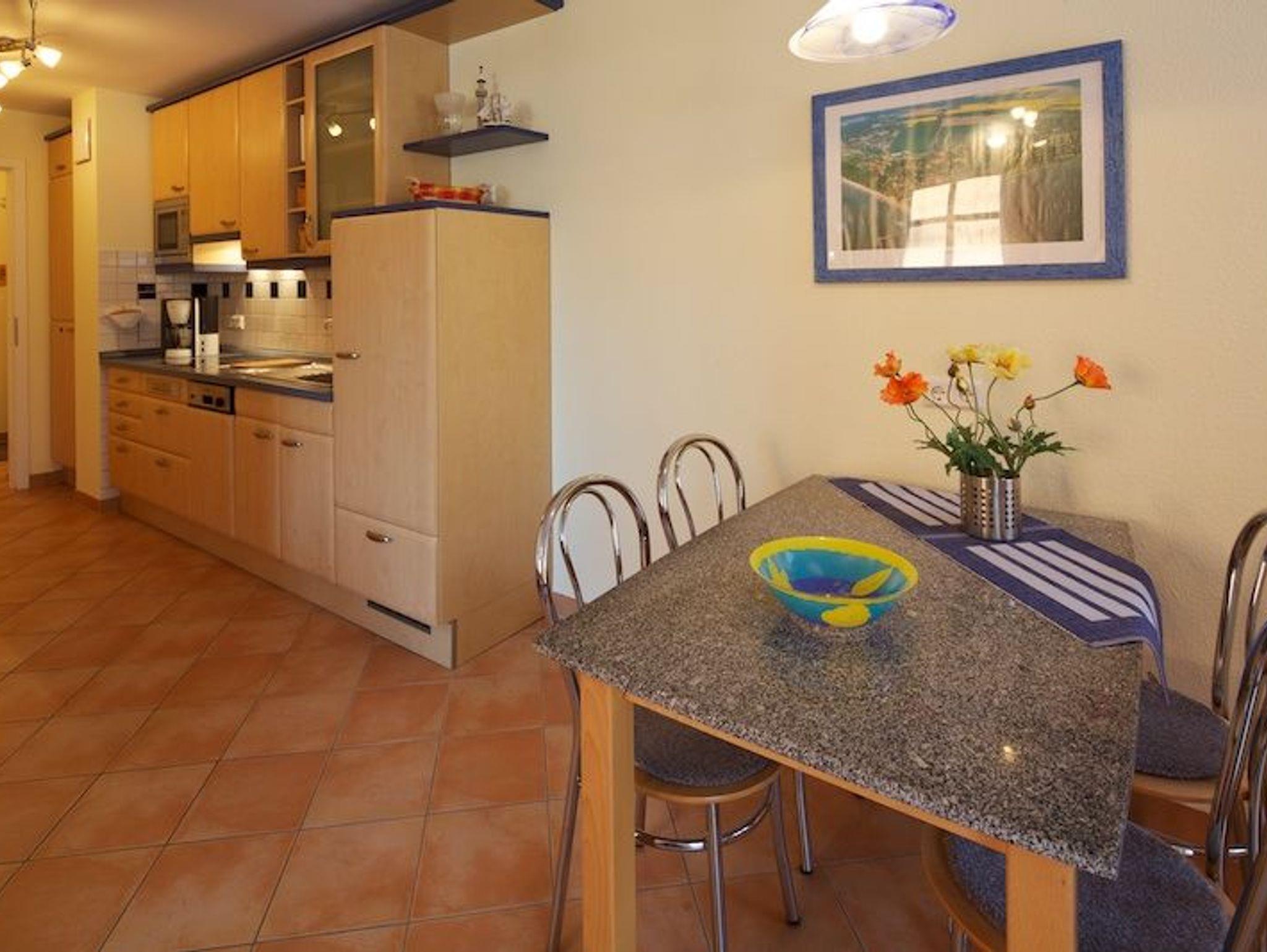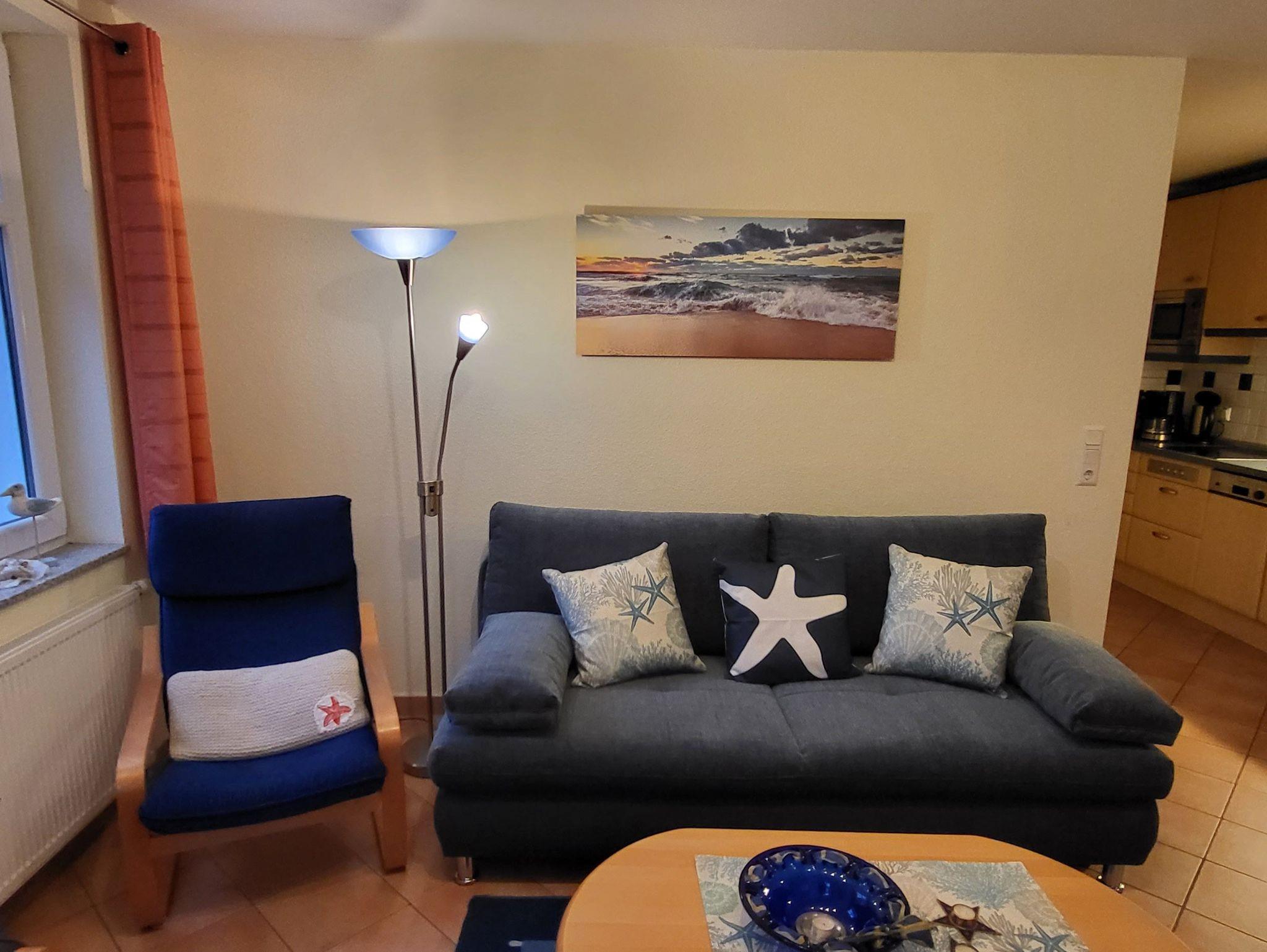 Die im I. OG gelegene Wohnung, in warmen und hellen Farben mit maritimem Flair, hat eine offene, moderne Küche, mit Geschirspüler, Cerankochfeld, Mirowelle, Kaffemaschine, Wasserkocher und vieles mehr.