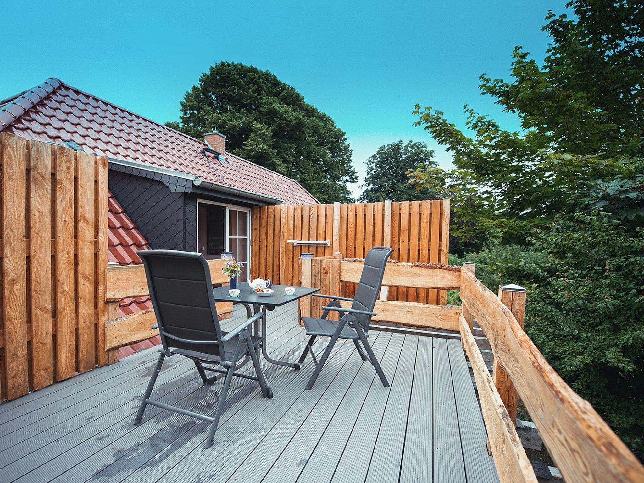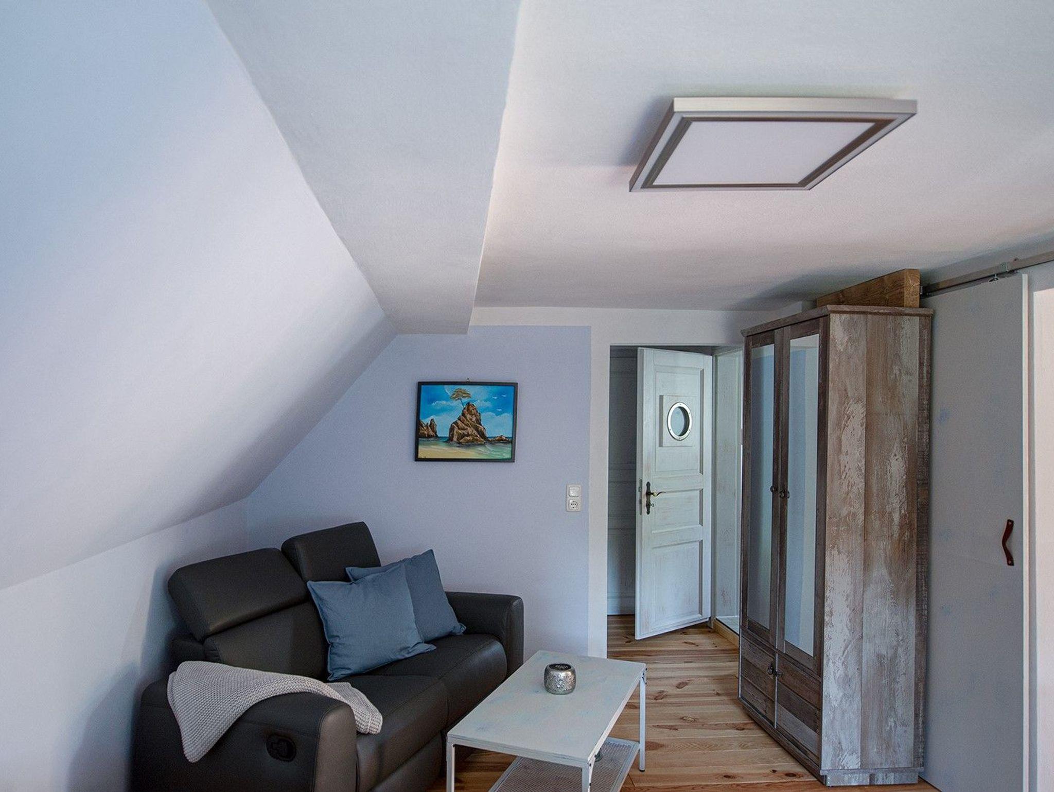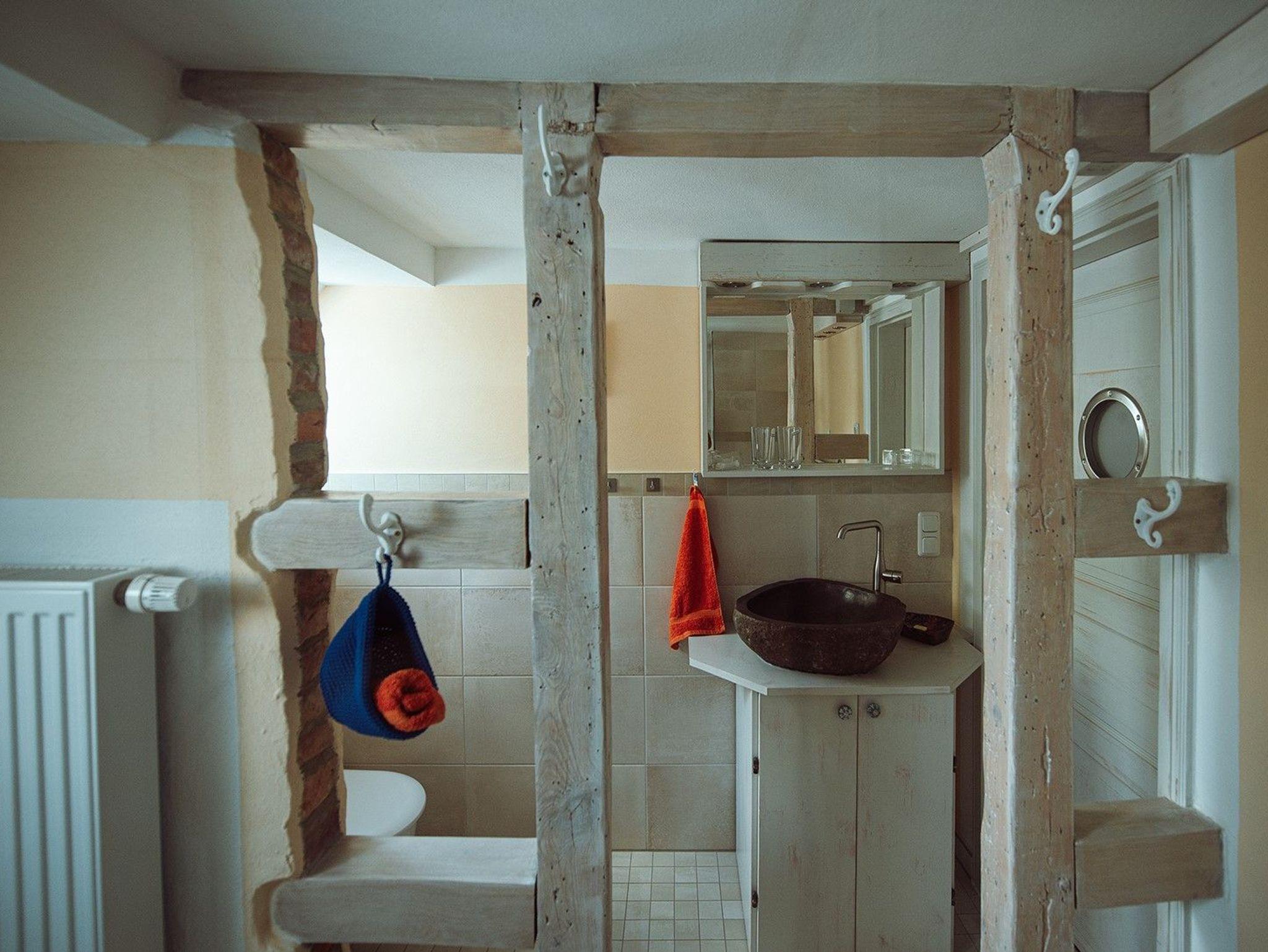 Die Ferienwohnung liegt im 1. OG und der Zugang erfolgt über eine breite Außentreppe und die zur Ferienwohnung gehörige Dachterrasse. Da es sich um einen typischen Gutsverwalterhof aus dem Jahr 1860 handelt, sind die Decken in der Ferienwohnung nur 2,05m hoch. Bitte beachten Sie dies bei der Auswahl der Wohnung!