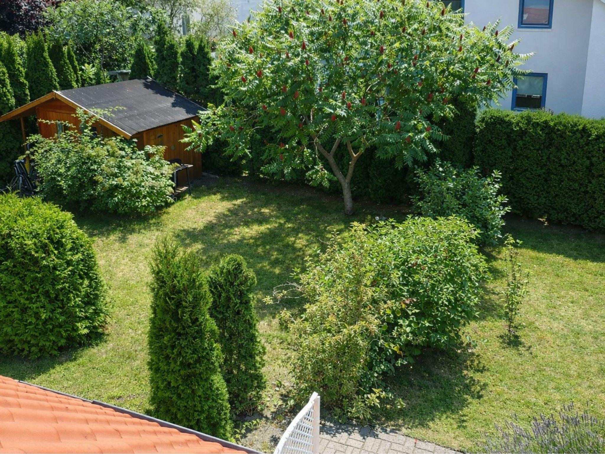 Parkplatz, Fahrradunterstellmöglichkeit, Terrasse mit Sitzmöbeln und Grill, eingezäunter Garten.