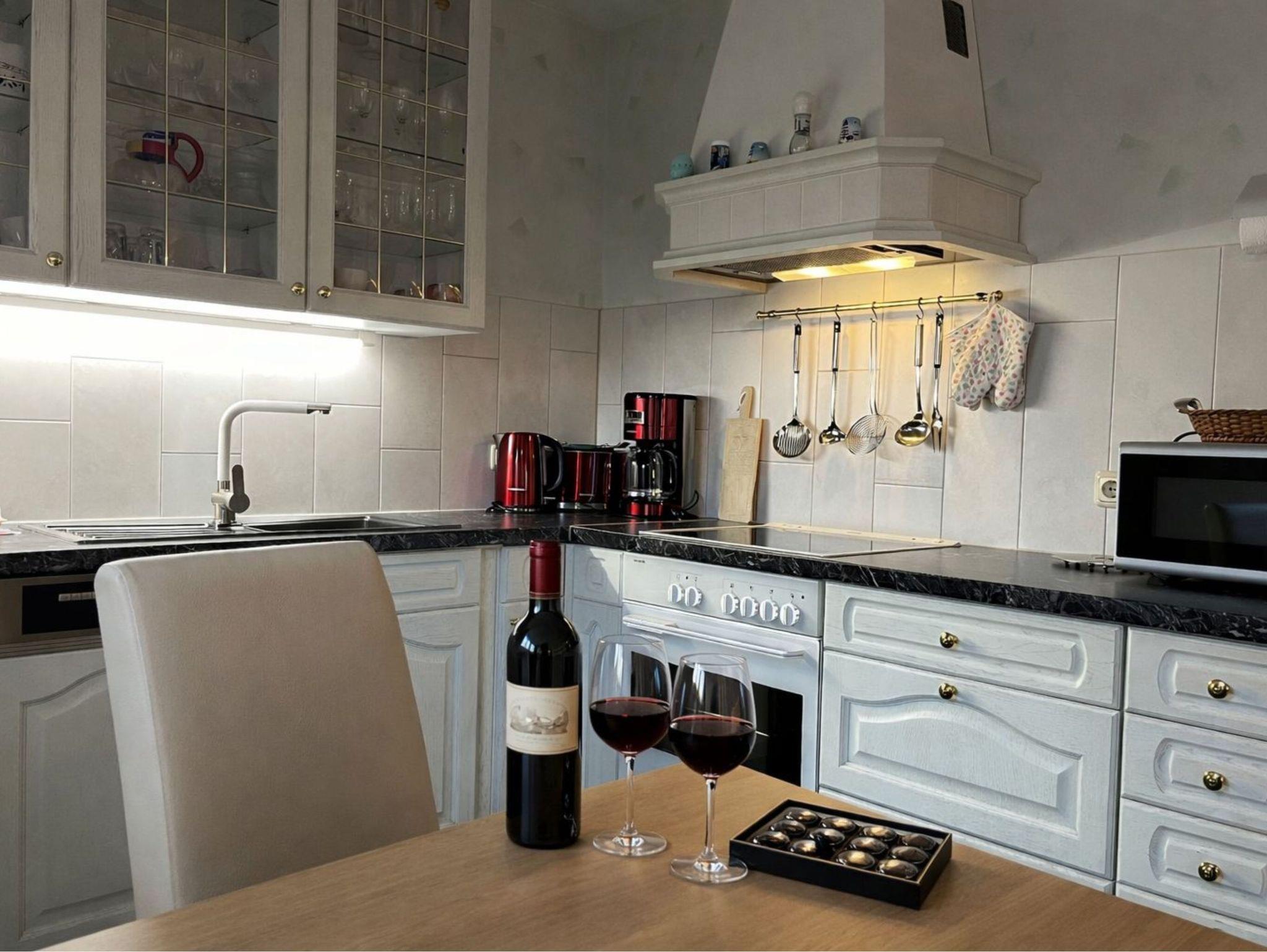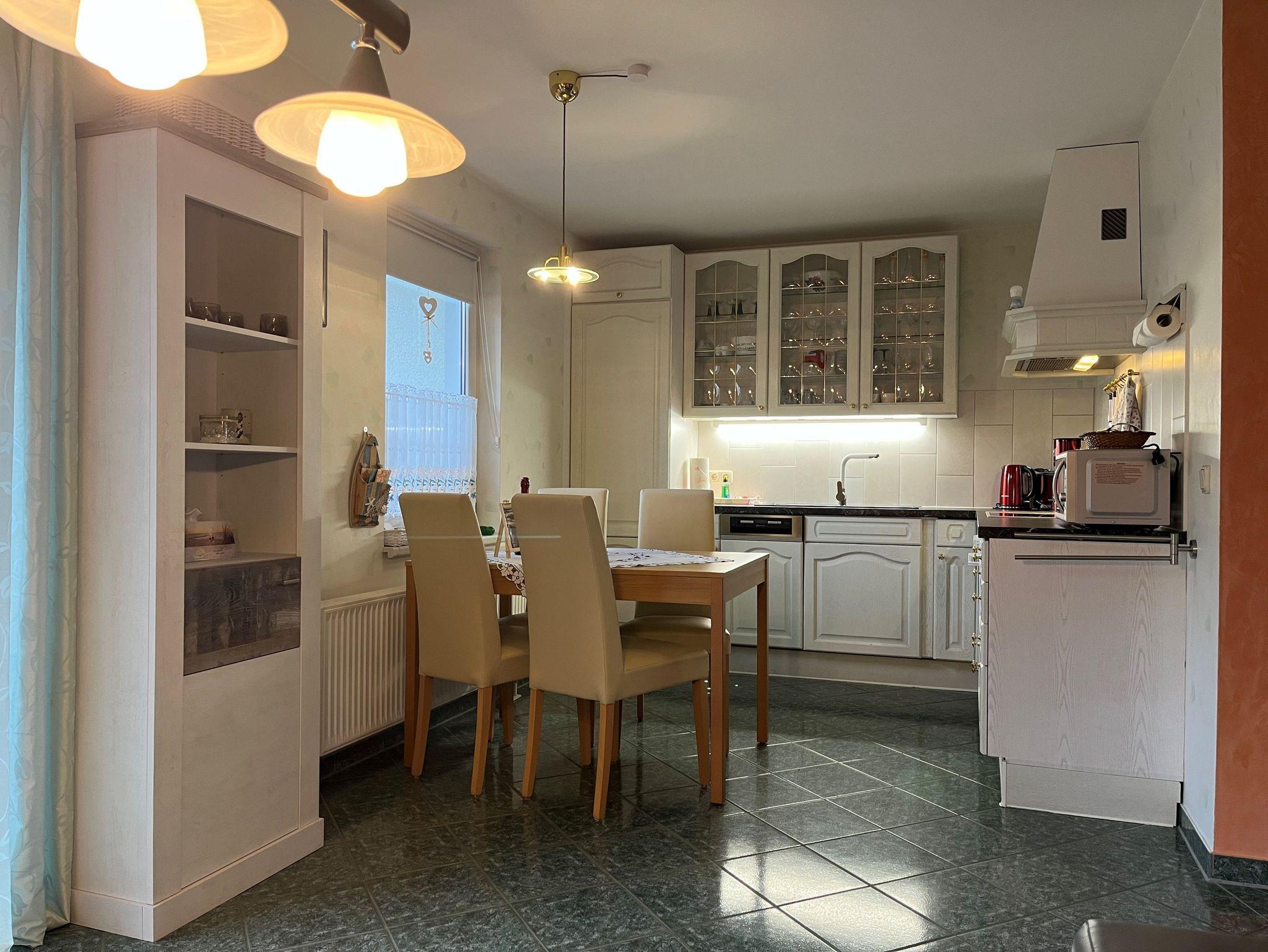 offene Küche, 4 Platten-Ceran-Herd mit Backofen, Kühlschrank mit Gefrierfach, Mikrowelle, Spülmaschine, Wasserkocher, Kaffeemaschine, Toaster