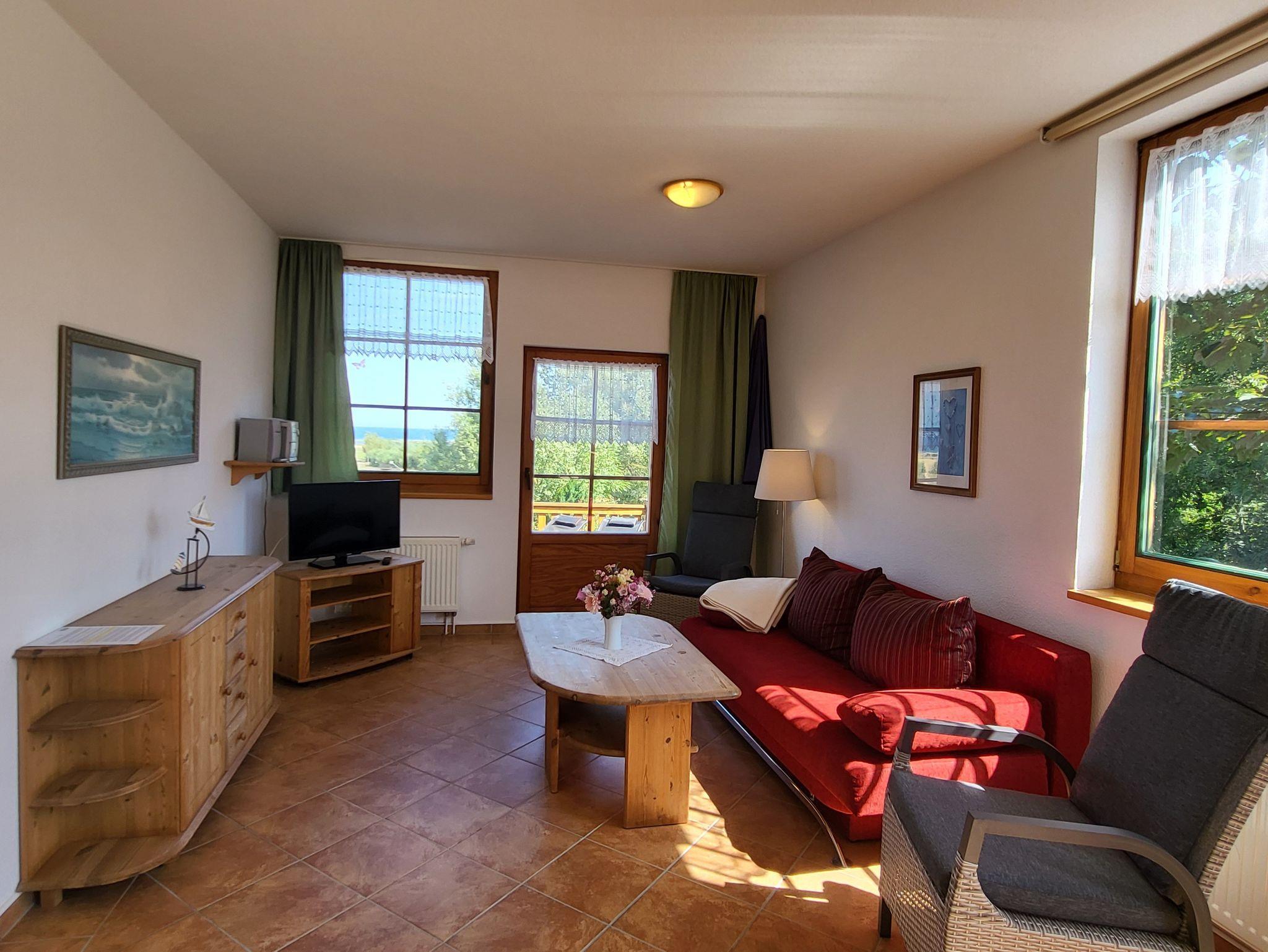 Das 2-Zimmer-Appartement ist seeseitig, mit Balkon, einem separatem Schlafzimmer, sowie einem Wohnzimmer mit Schlafsofa, befindet sich im Obergeschoß und ist 57 qm groß.