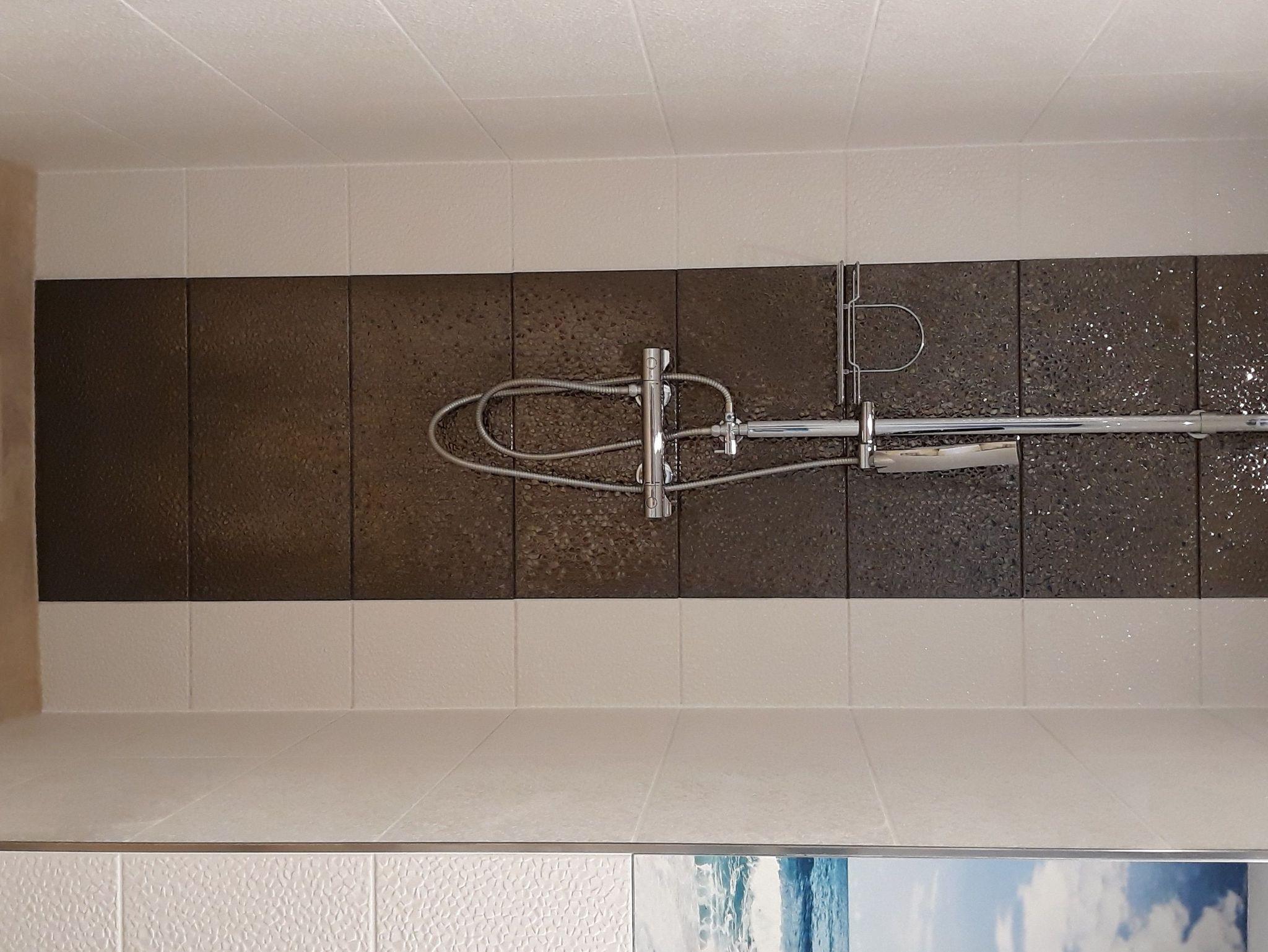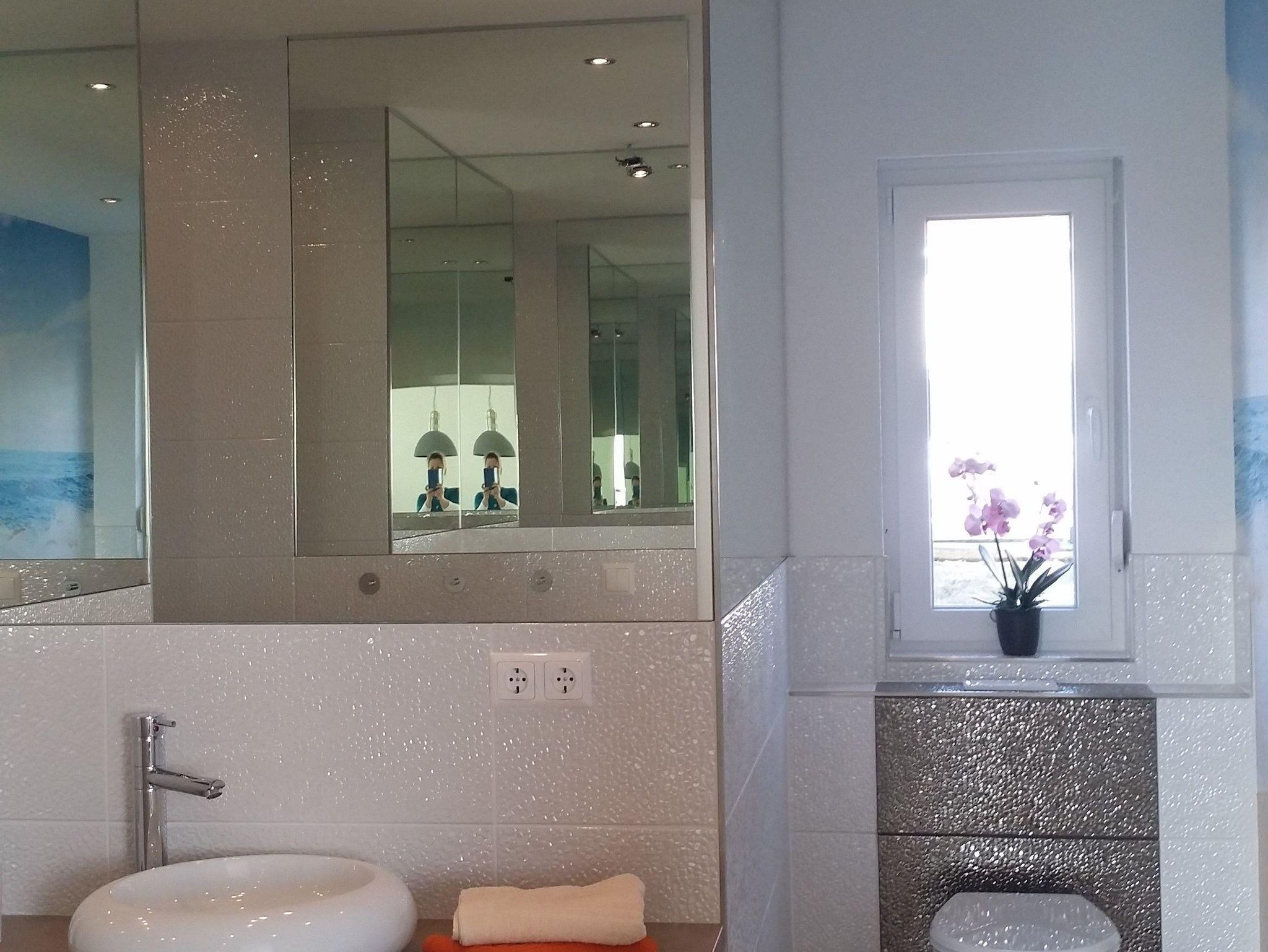 freistehendes helles Wohlfühl-Ferienhaus mit viel Liebe zum Detail eingerichtet mit hochwertiger Ausstattung , Wellnessbad mit Spiegelwand, Wand-WC, Badmöbelanlage, bodengleicher Dusche mit Regenkopf- und Handbrause,