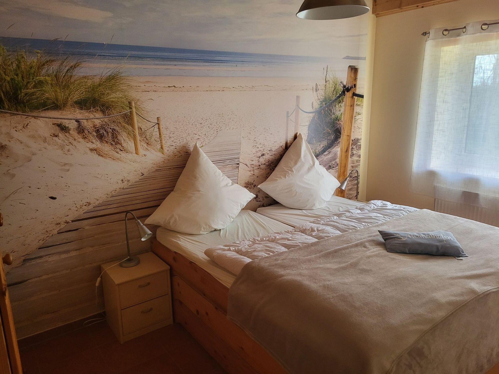 Es gibt zwei Schlafräume: Schlafraum 1 verfügt über ein Doppelbett (1,80m breit), in dem zwei Babybetten aufgestellt werden können (ein Babybett ist vorhanden, weitere nach Verfügbarkeit). Schlafraum 2 bietet Etagenbetten, die wahlweise als ein Doppelbett oder drei Einzelbetten gestellt werden können. Das Duschbad verfügt über eine Toilette, einen Fön und eine Fußbodenheizung.