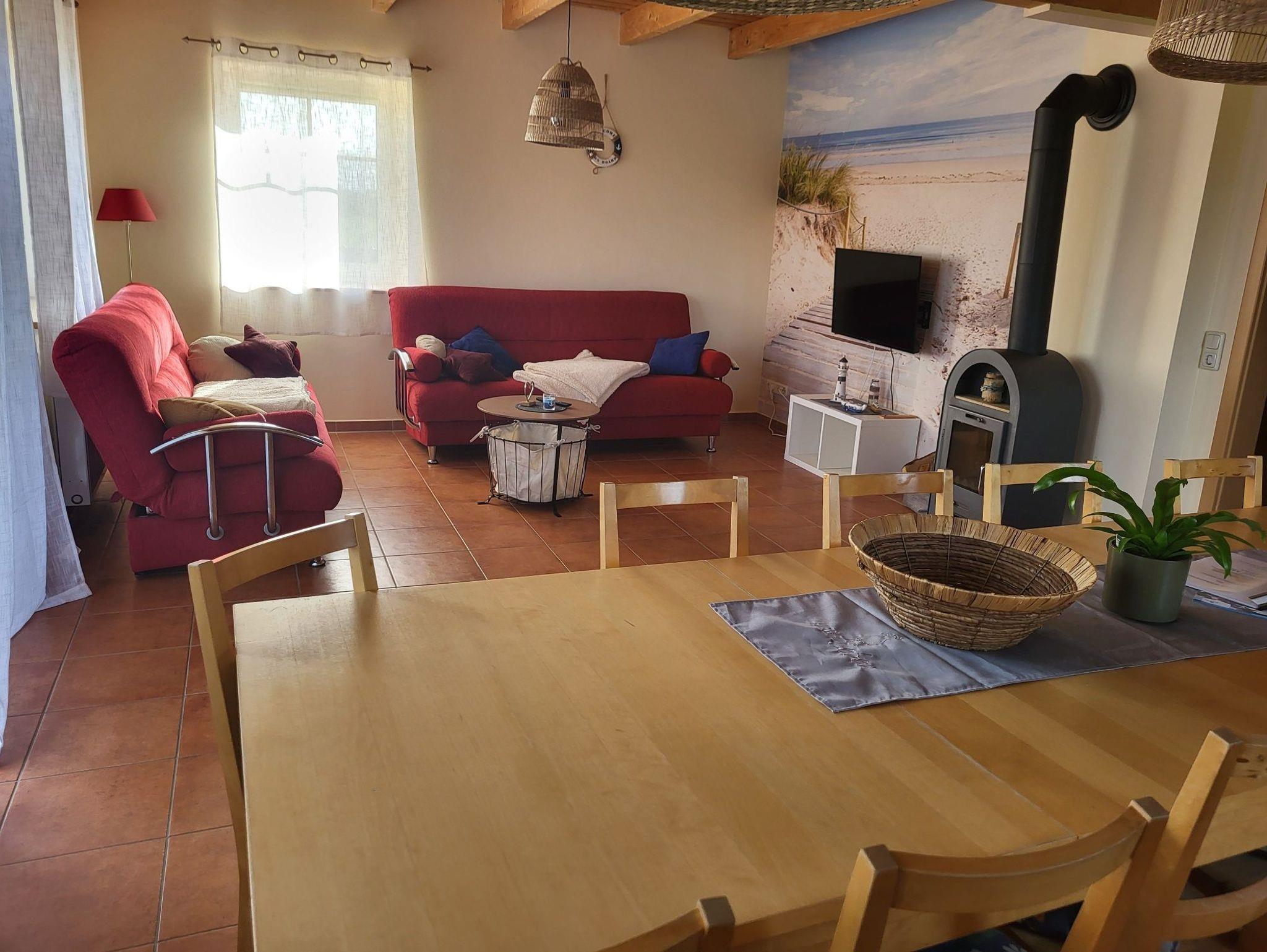 Der große Wohnraum ist mit einem Kamin, einer Sitzecke (mit Schlafcouch), Sat-TV, CD-Player, Radio und einer Küche ausgestattet. Die integrierte Küchenzeile verfügt über einen Geschirrspüler, einen Ceran-Herd, eine Dunstabzugshaube, einen Backofen, einen Wasserkocher, eine Kaffeemaschine und einen Toaster.