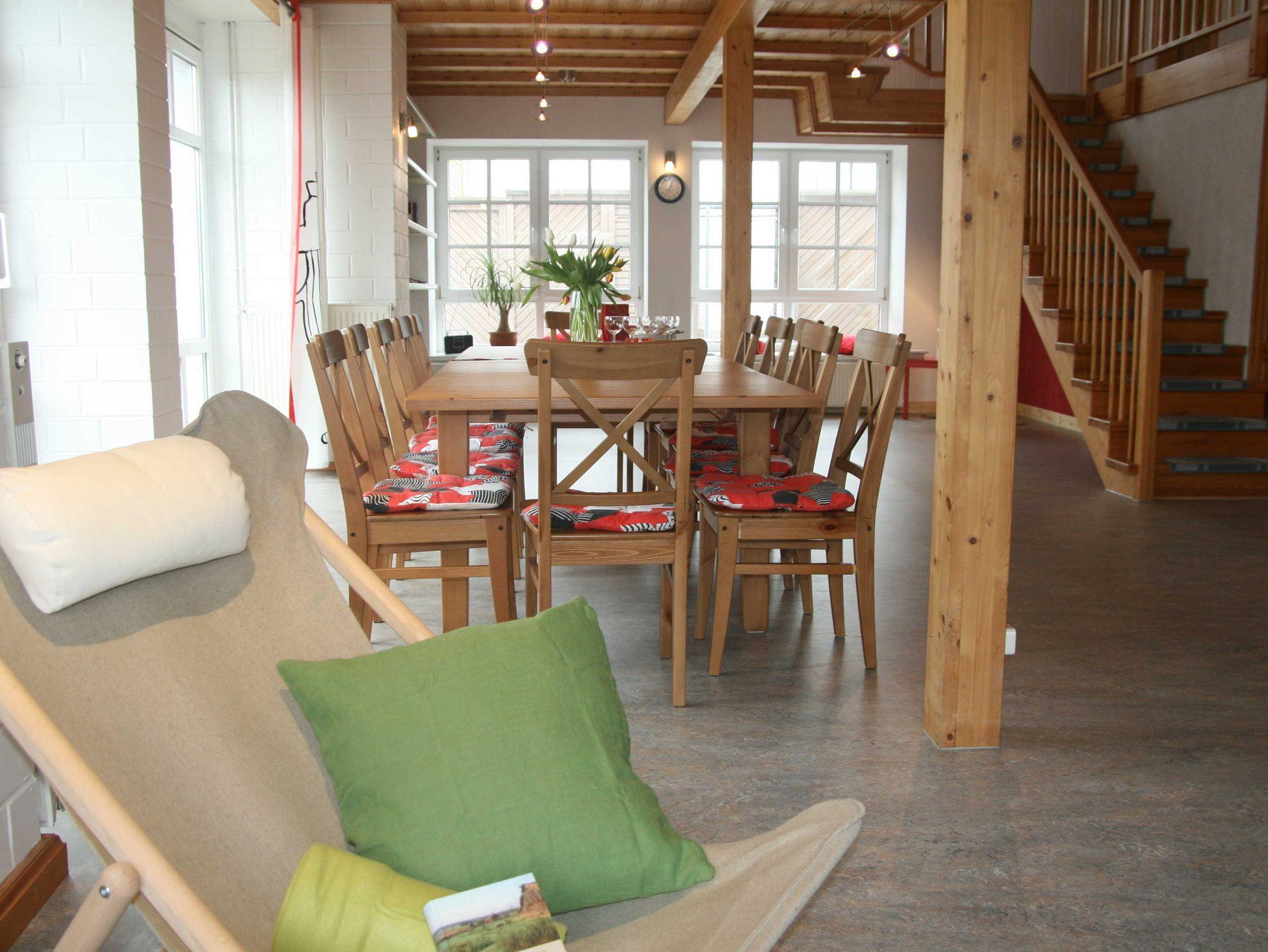 Komplettbuchung des gesamten 10-Raum-Ferienhauses (270 m², max. 14 Pers.), ideal für Großfamilien und Kleingruppen: 7 Schlafräume, 3 Duschbäder/WC, Waschmaschine, 2 Wohnräume mit TV, grosser Küche und Gemeinschaftsraum für gemeinsames Essen, Spielen und Feiern. Das Ferienhaus besteht aus zwei kombinierbaren FeWos: FeWo M (3-Raum; 70 m², max. 4 Pers.) und FeWo L (7-Raum; 200 m²; max. 10 Pers.) einzeln oder wahlweise kombiniert als Ferienhaus XL (10-Raum; 270 m², max. 14 Pers.) buchbar. Jede Fewo mit Küche, Geschirrspüler, eigener Terrasse. Nichtraucherwohnungen, Raucherbereich im Garten.