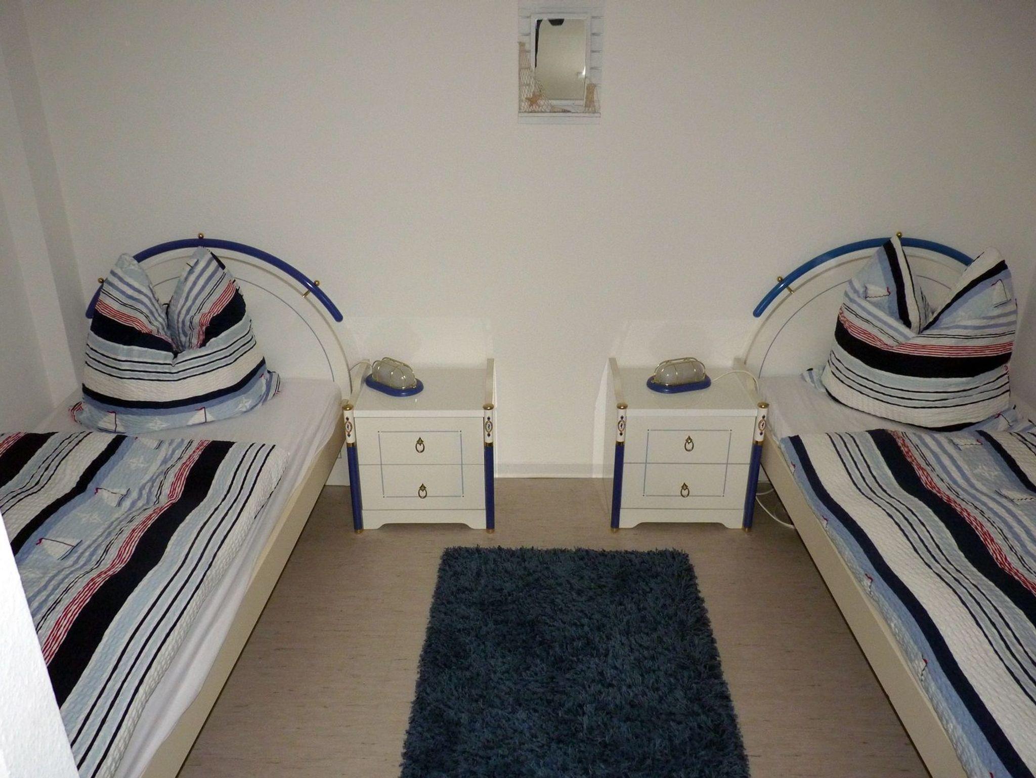 Das offene Schlafzimmer ist mit 2 Einzelbetten ausgestattet.