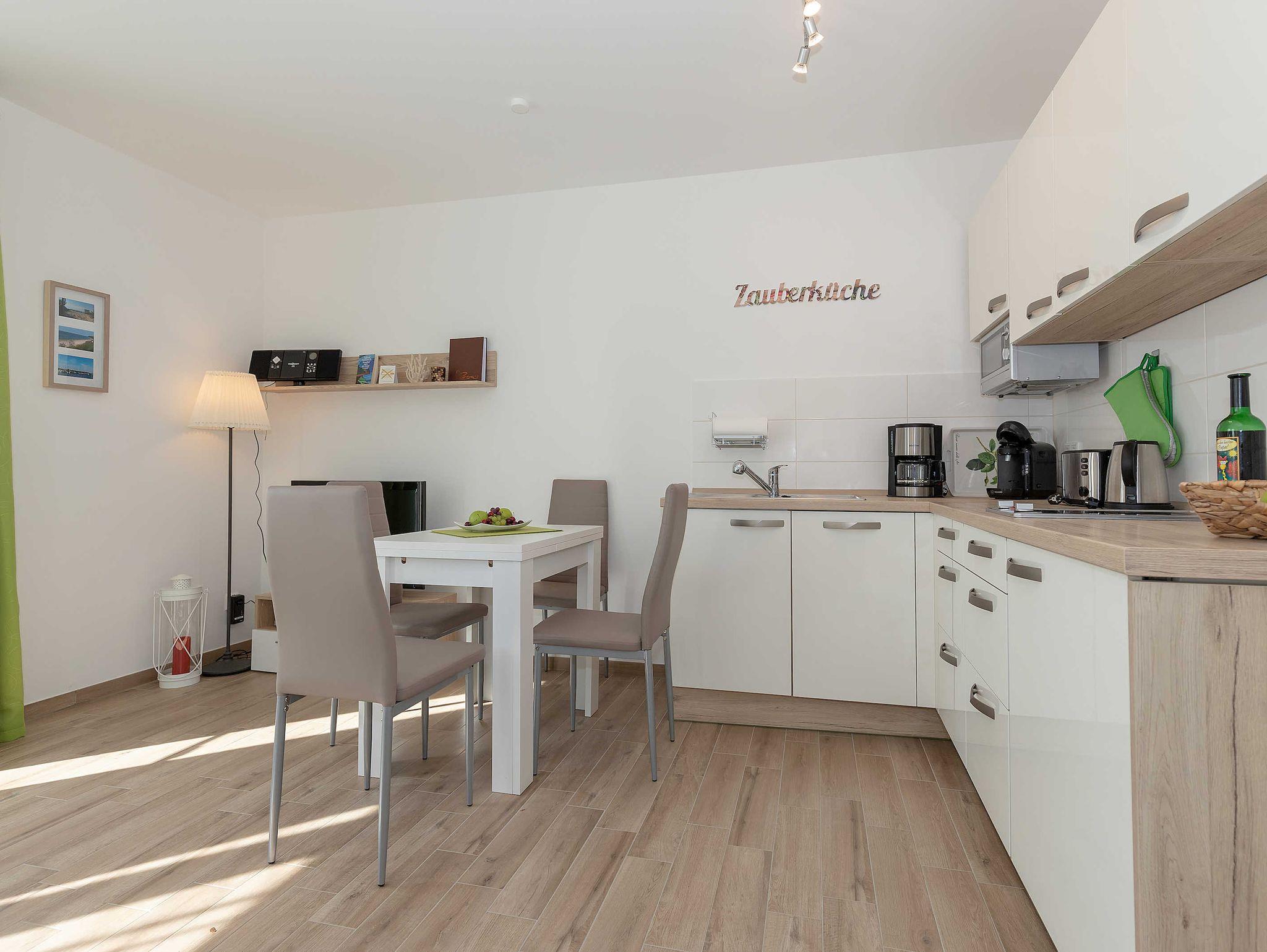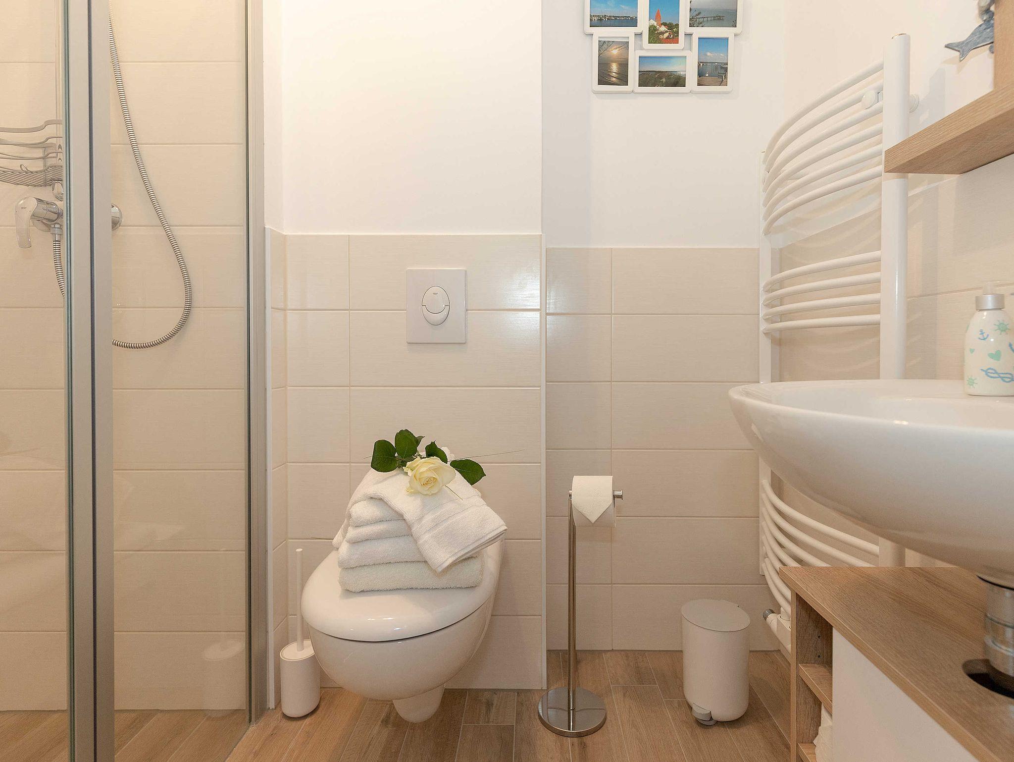Das schicke Bad hat eine bodengleiche Dusche. Die Wohnung hat einen pflegeleichten Fliesenboden in Holzoptik. Zur Wohnung gehört außerdem ein Abstellraum für Reinigungsutensilien, in dem Ihre Koffer Platz finden. Auch gut erzogene Hunde dürfen gerne hier Urlaub machen.