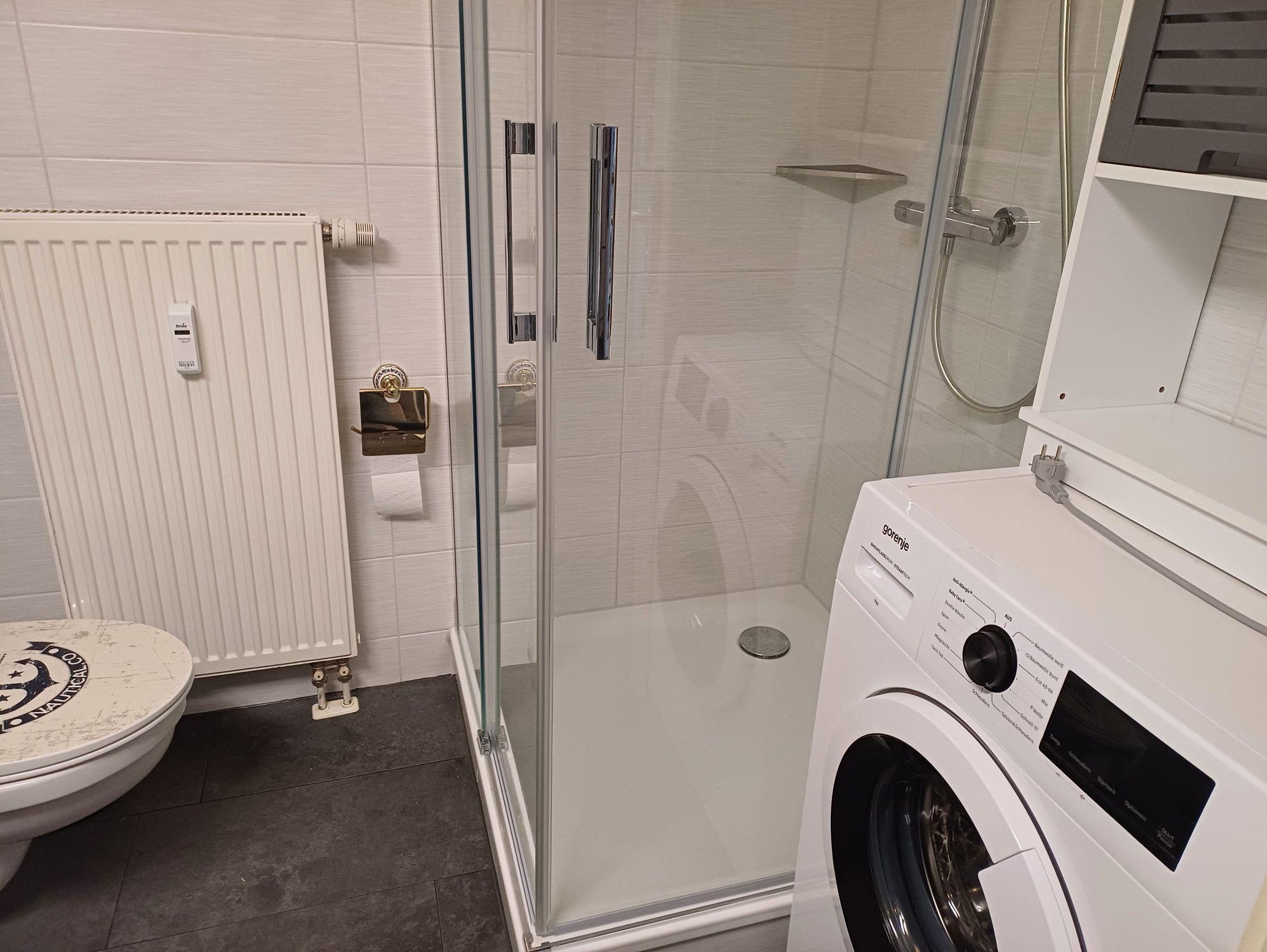 Innenliegendes Bad mit begehbarer Dusche, WC und Waschmaschine