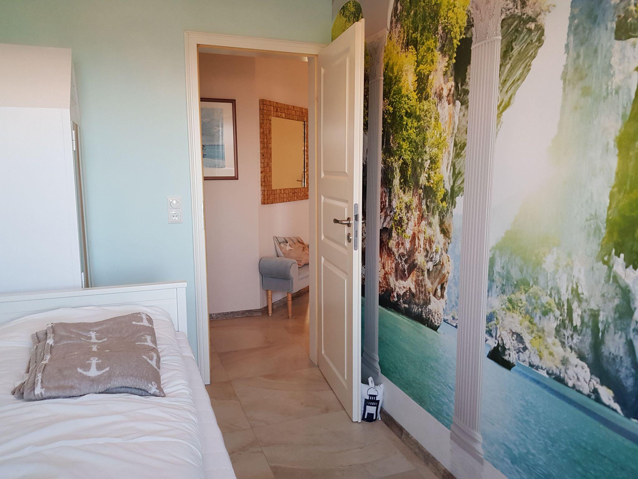2 Schlafzimmer, ein französisches Doppelbett der Breite 1.50m und Länge 2.00 m, das Kinderzimmer verfügt über ein Einzelbett 0,80 m x 2,00 m, Tiefgaragen- Stellplatz. Kostenlose Benutzung von