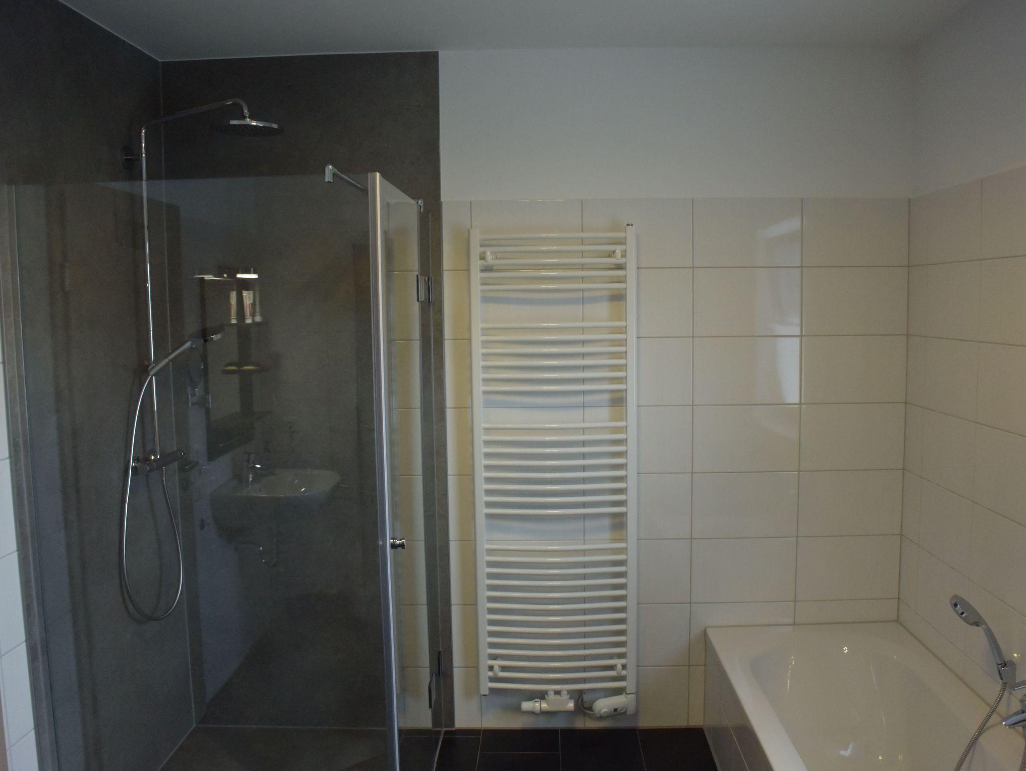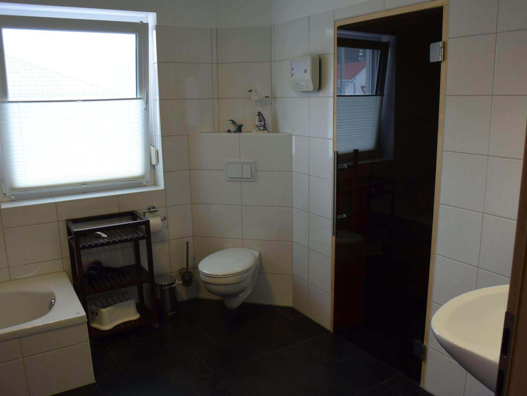 Bad mit Dusche, Badewanne, WC, zusätzlicher Sprossenheizkörper für Handtücher, Waschmaschine, Wäscheständer, Sauna, Fön, Gäste-WC