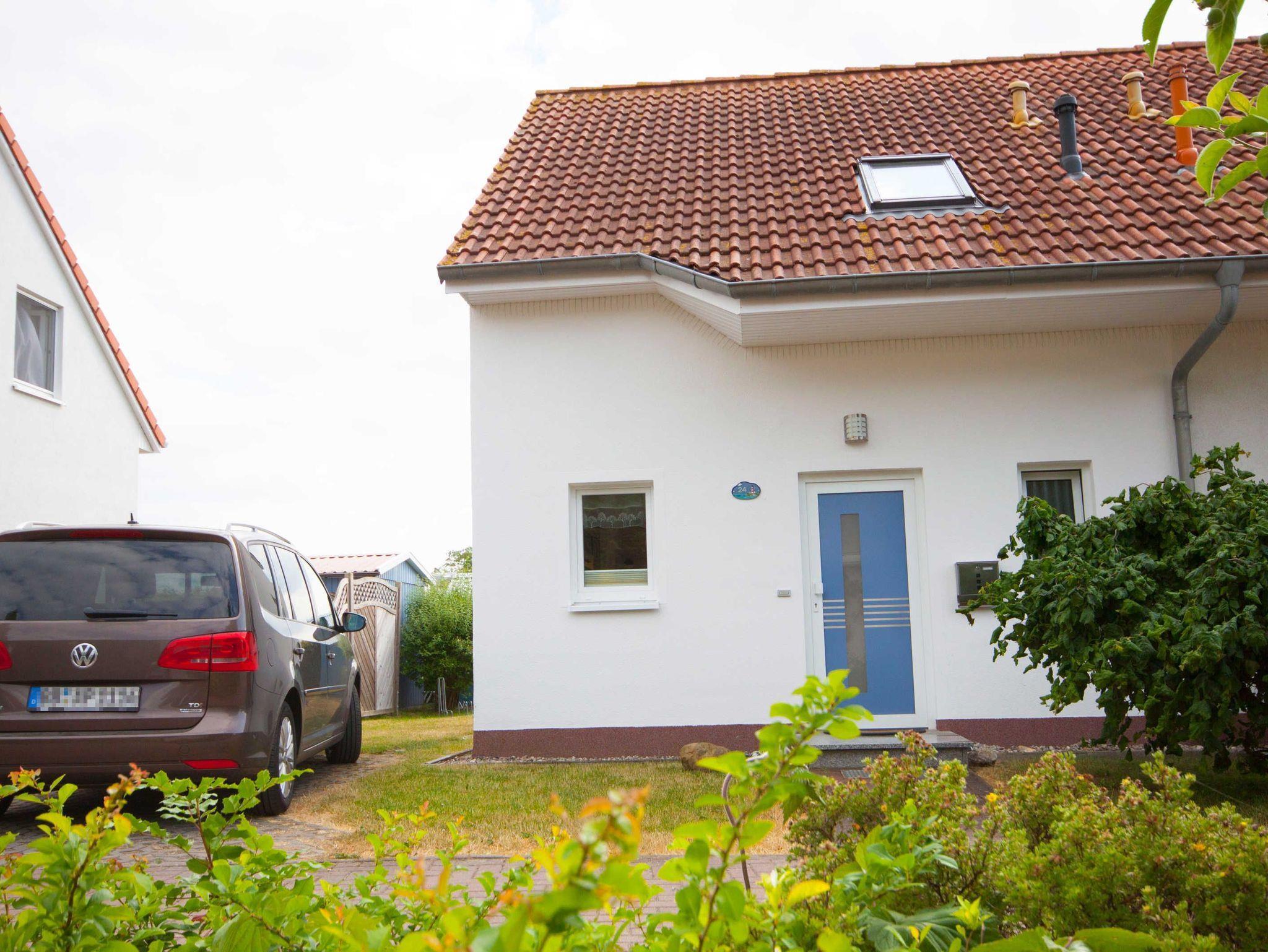 Doppelhaushälfte und Terrasse mit Abendsonne im kleinen beliebten Ferienhauspark Leuchtturmstraße, direkt an der Steilküste unmittelbar hinter dem Küstenwald, man hört das Rauschen der Ostseebrandung. Sehr ruhig und ohne Autolärm. Nur 350 m zum Zentrum mit Einkaufsmöglichkeiten, Supermarkt, Bäcker, Apotheke, Fahrradverleih, Angelshop. Zum Salzhaff mit seinem kleinen Hafen und Gaststätten mit Seeblickterrassen, Bootsverleih und Wassersportcenter 900 m.