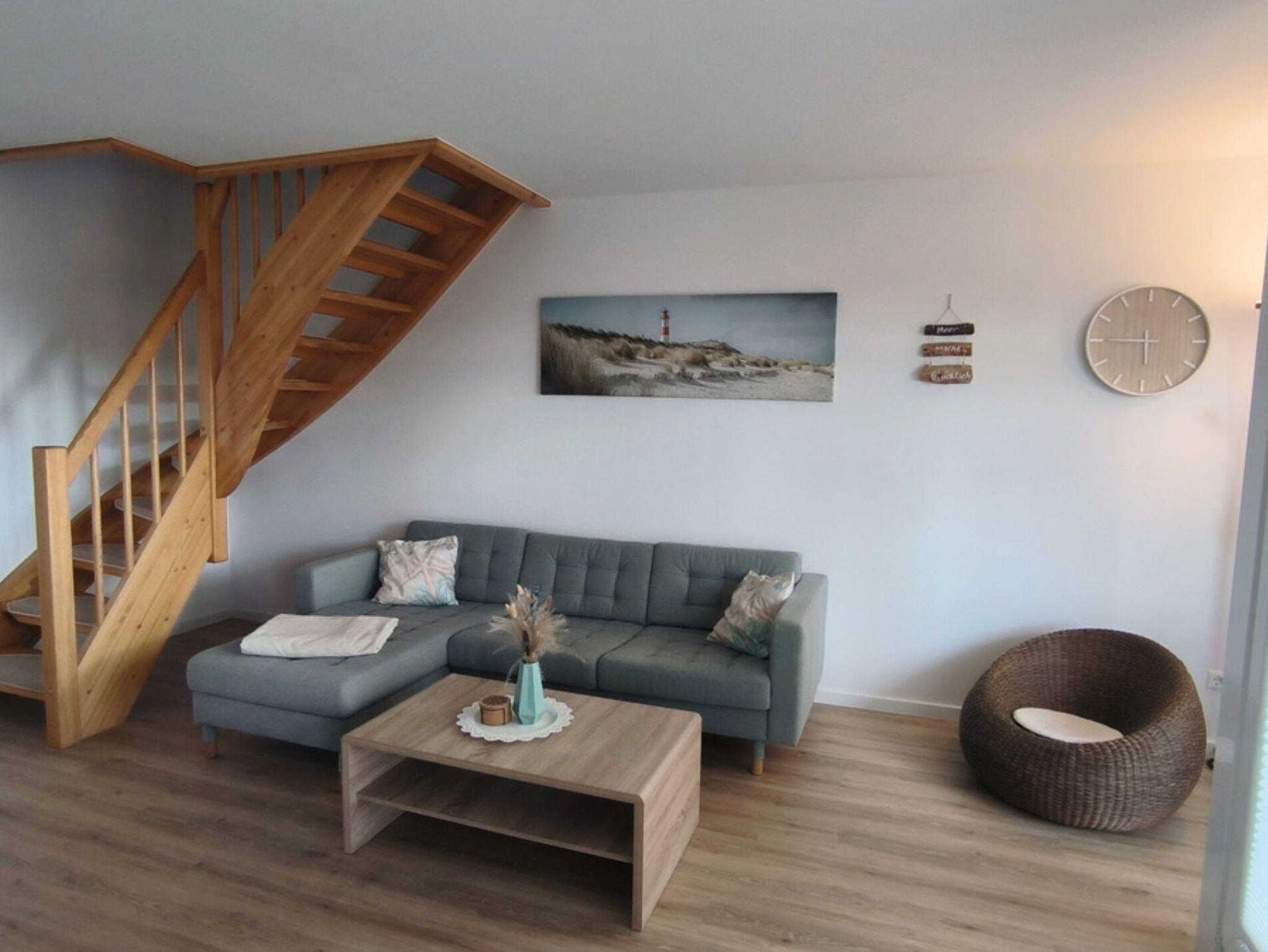Die 3-Raum Ferienwohnung hat eine sehr schöne Raumaufteilung und umfasst in seiner 1. Etage neben dem Wohnungsflur, dem Wohnzimmer mit direktem Zugang zur kleinen Dachterrasse und angrenzender, offene Küche auch ein Schlafzimmer und ein Tagelichtduschbad. Vom Wohnzimmer aus gelangt man über eine bequeme Treppe in das Dachgeschoss. Dort kommt man über einen kleinen Vorflur in ein charmantes weiteres Schlafzimmer.