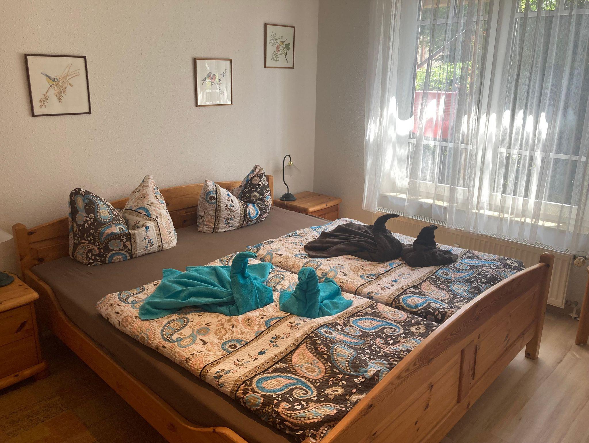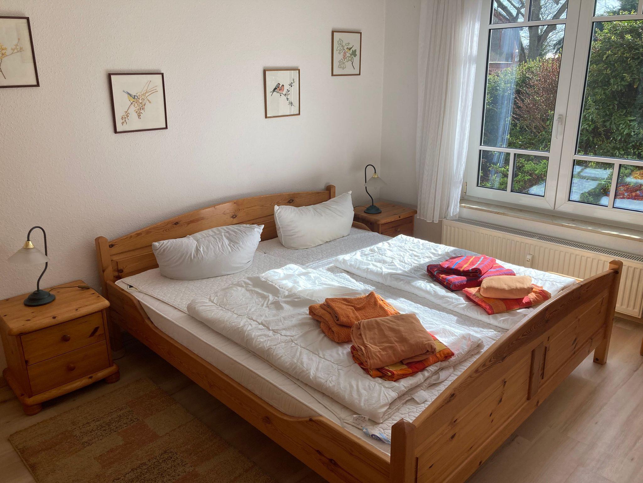 3-Zimmer Komfort-Ferienwohnung 63qm im Erdgeschoß mit Terrasse zur Südseite (mit Tisch und Stühlen), 1 gr. EWZ mit komplett eingerichteter Küche, 1 Schlafz. mit Doppelbett, 1 Schlafzimmer mit 2 Einzelbetten, 1 DU/WC, 1 WC, Kinderbett und -hochstuhl, eigenes kostenfreies WLAN. Damit Sie es sich richtig gutgehen lassen können, haben wir die Betten bezogen und Ihnen Handtücher hingelegt.