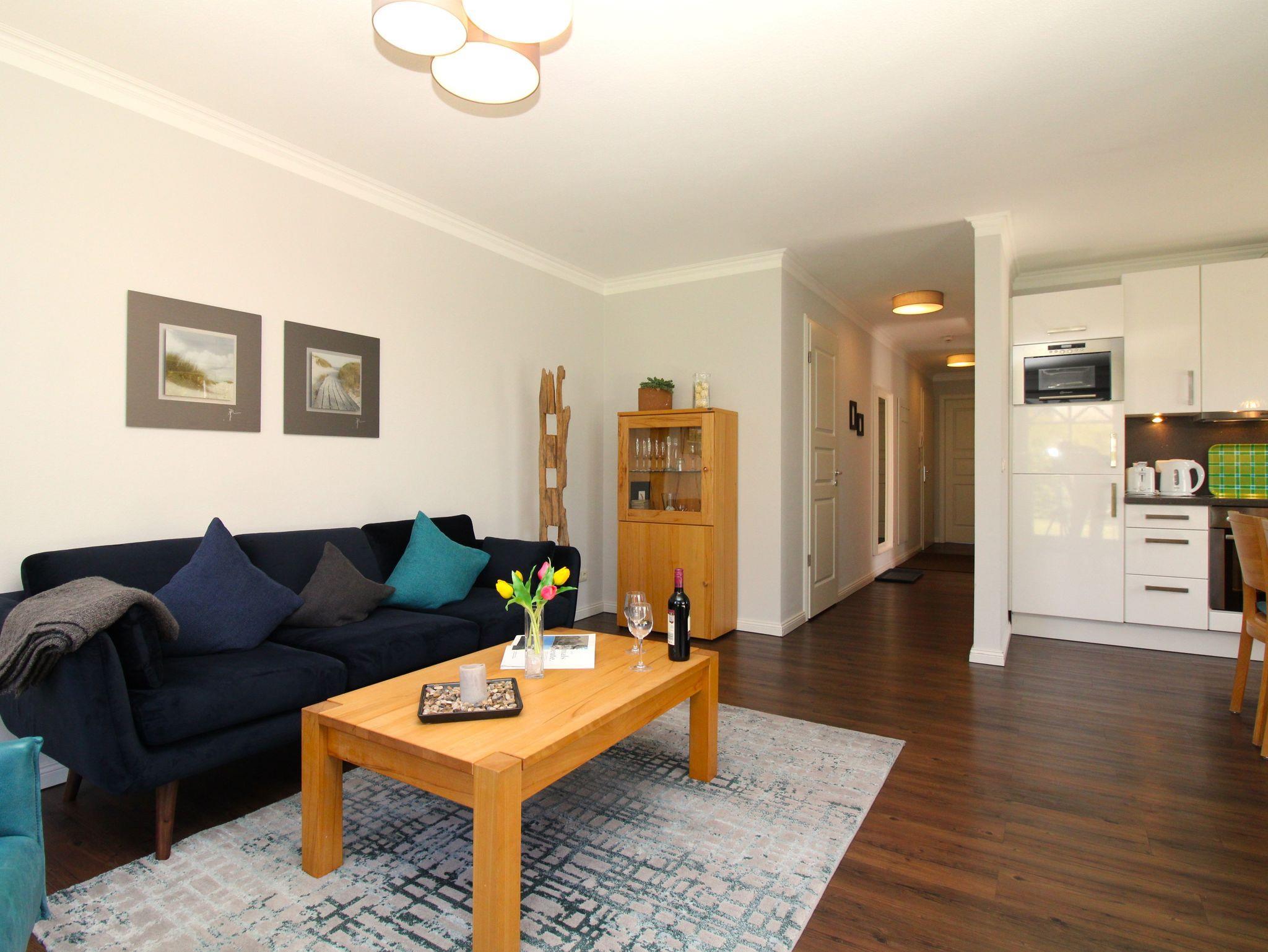 Das Wohnzimmer wird durch bodentiefe Fenstertüren lichtdurchflutet und bietet direkten Zugang zur großzügigen Terrasse mit Südost- Ausrichtung. Die angeschlossene und offene Einbauküche ist komplett ausgestattet mit Backofen, Ceranfeld, Wasserkocher, Toaster, Kaffeemaschine, Pad-Maschine, Kühlschrank mit Gefrierfach und einer Mikrowelle.