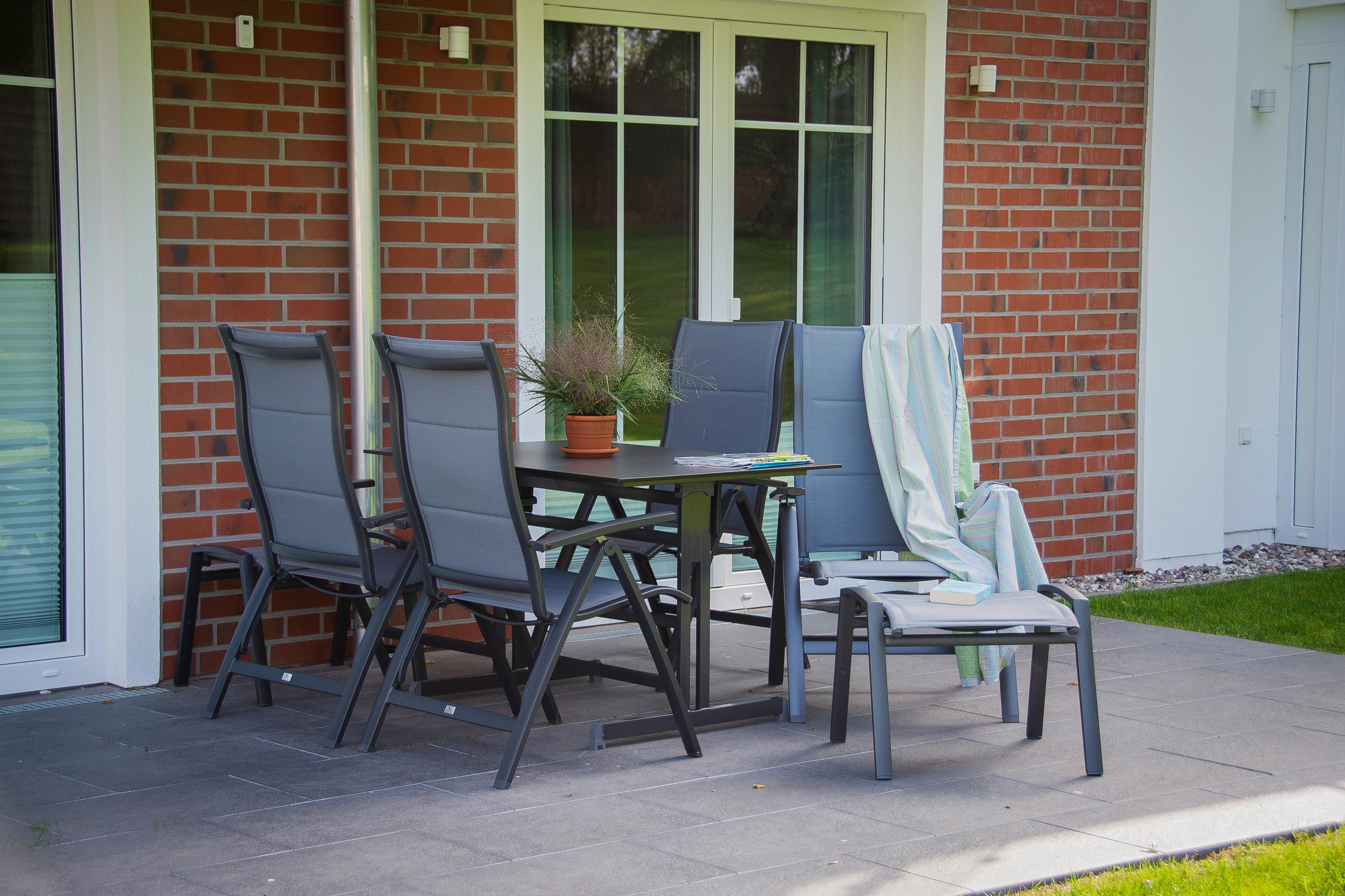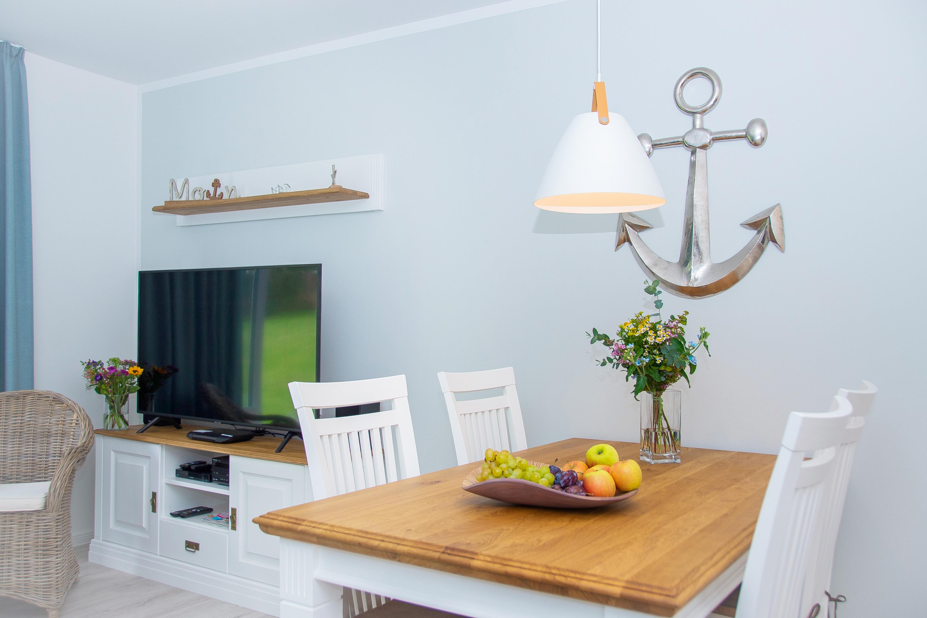 Es schließt sich der Wohn- und Essbereich mit offener Küche an. Der WOHNBEREICH lädt mit einem gemütlichen Ecksofa und Korbsessel zu gemeinsamen Abenden ein. Für Unterhaltung sorgen Stereo-Anlage/Blu-Ray sowie kostenloses WLAN/LAN. Dank Flachbild-Smart-TV müssen Sie auch im Urlaub nicht auf Ihre Lieblingsserien verzichten. Schauen Sie diese einfach über Ihren eigenen Zugang. Von hier gelangen Sie auf die möblierte Terrasse. Ein perfekter Ort zur Entspannung nach einem wunderschönen Urlaubstag.