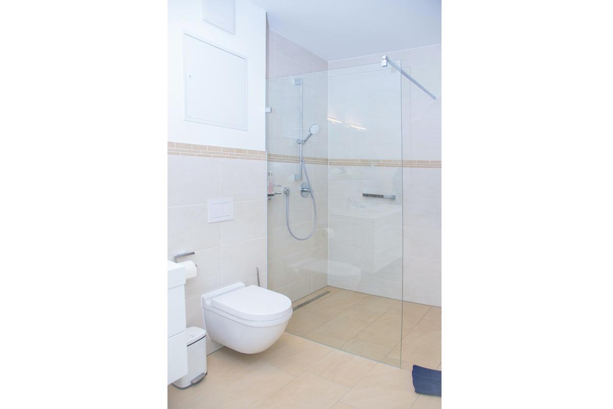 Das BADEZIMMER ist hochwertig gefliest. Mit ebenerdiger Dusche, einem Doppel-Waschtisch, Föhn und Handtuchwärmer sorgt es für Komfort.