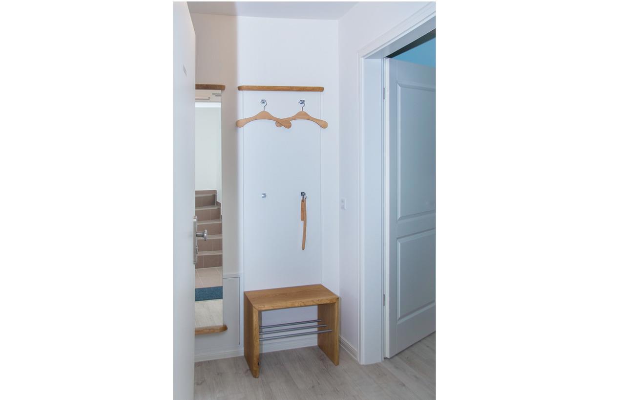 Ihre Ferienwohnung liegt im EG des Cottage. Im kleinen Flur gibt es eine Garderobe mit Schuhregal und