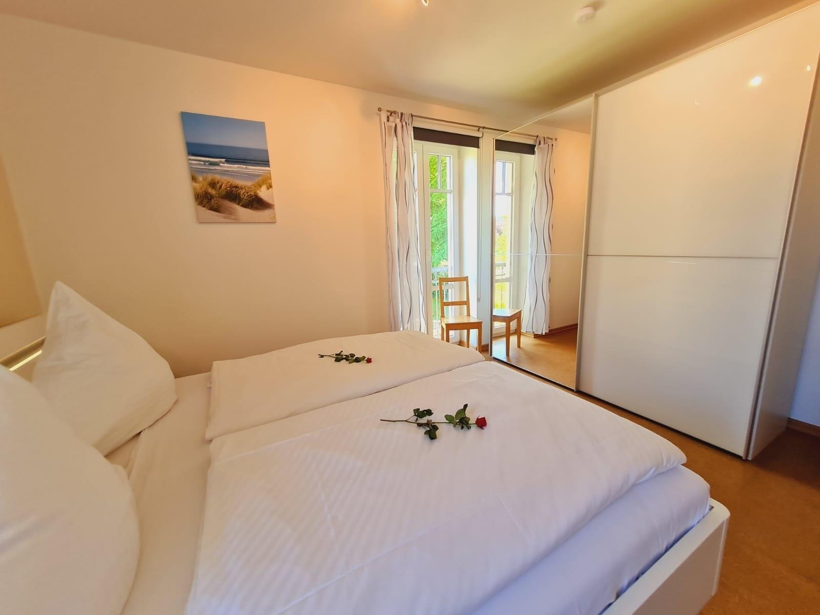 Das 54m² komfortable Drei-Raum-Appartement für Nichtraucher in der Villa Rosita hat zwei separate, komplett verdunkelbare Schlafzimmer; eines mit Doppelbett in Komforthöhe zum bequemen Ein- und Aussteigen und mit zwei Einzelbetten, ebenfalls in Komforthöhe. Im Schlafzimmer mit Doppelbett finden Sie einen großen geräumigen Kleiderschrank und viel Stauraum für Ihre Sachen. Das zweite Schlafzimmer ist mit einer großen Kommode möbliert.