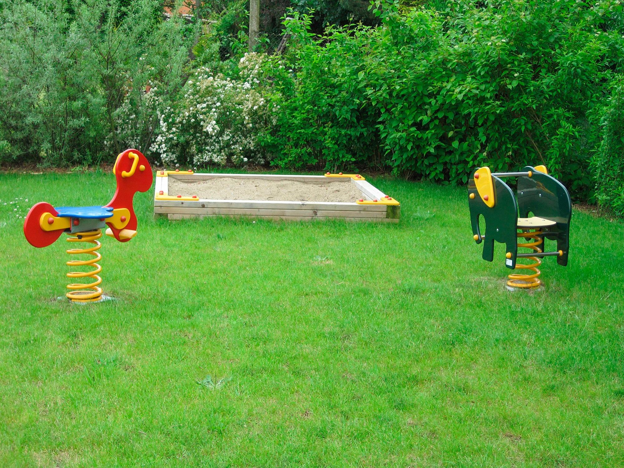 Der Spielplatz in der gepflegten Grünanlage hinter dem Haus bietet Wippen und einen großen Sandkasten. Neben dem Spielplatz befindet sich eine Sitzgruppe, sowie eine großzügige Liegewiese.