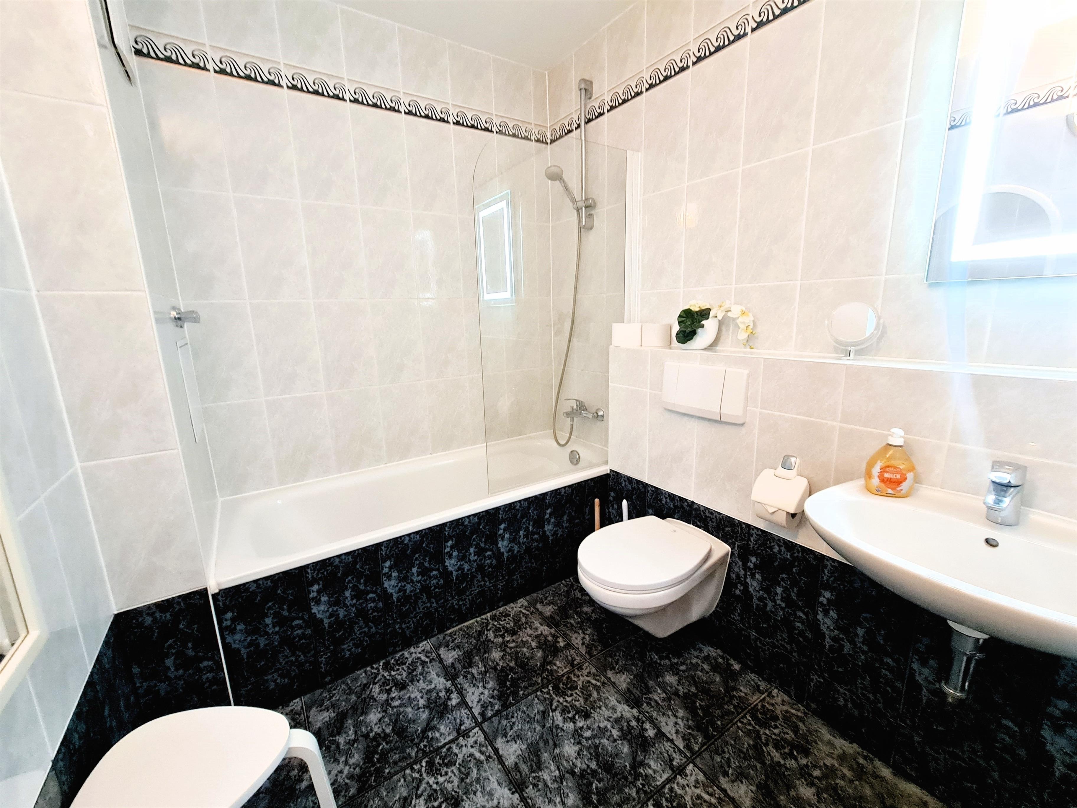Das Badezimmer ist hell und mit einem WC, Waschbecken, Badewannendusche ausgestattet.