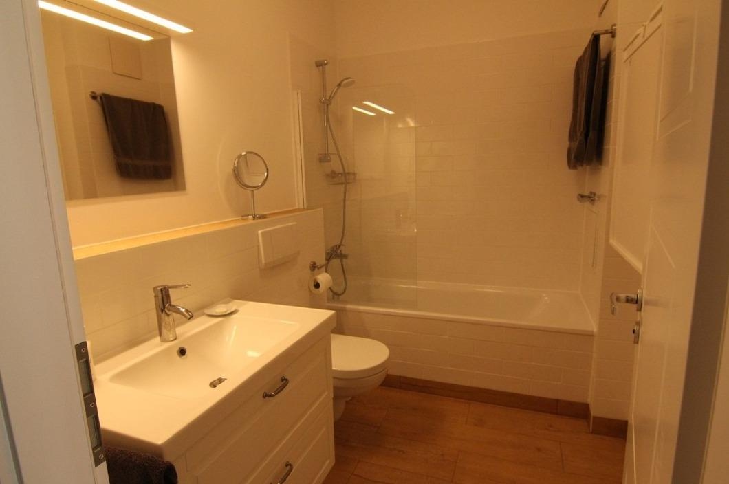 Die Ferienwohnung ist modern eingerichtet und wurde vor kurzem renoviert. Das Wohnzimmer verfügt über ein ausklappbares Schlafsofa, einen Essbereich sowie eine Küchenzeile. Diese ist mit Geschirrspülmaschine, Kochfeld, Mikrowellen/Backofen-Kombination und Kühlschrank mit Gefrierfach ausgestattet. Im Schlafzimmer haben Sie neben einem Doppeltbett (1,80m breit) auch die Möglichkeit, ein Babybett zuzustellen. Außerdem gibt es einen kleinen Schreibtisch.