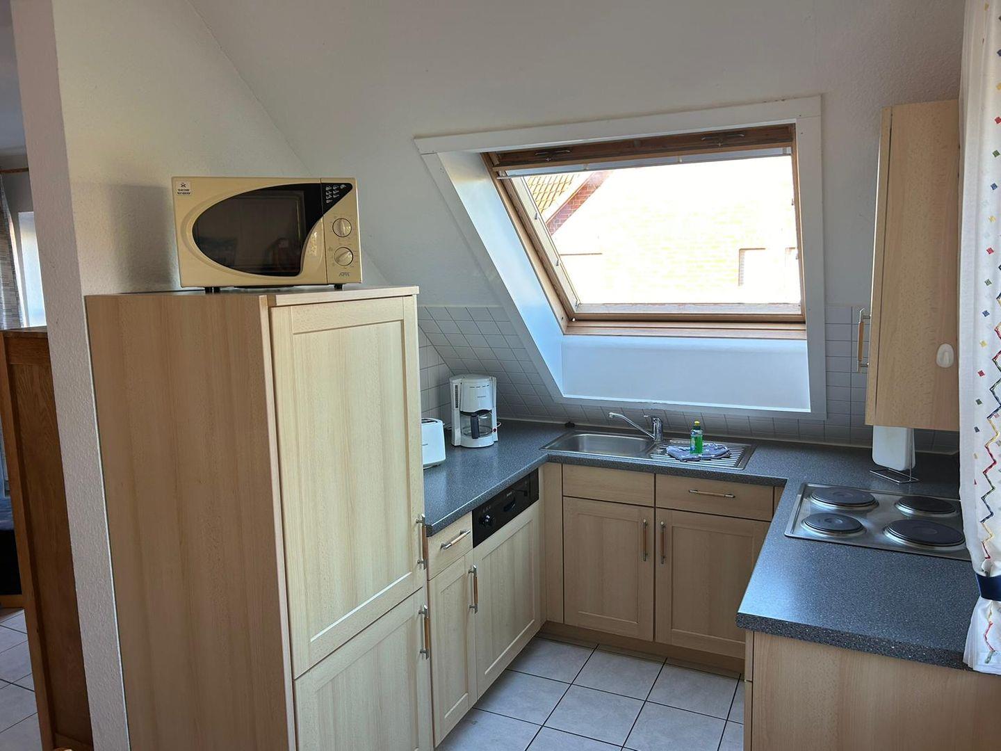 Die offene Küche ist mit Herd, Geschirrspüler und Mikrowelle ausgestattet.