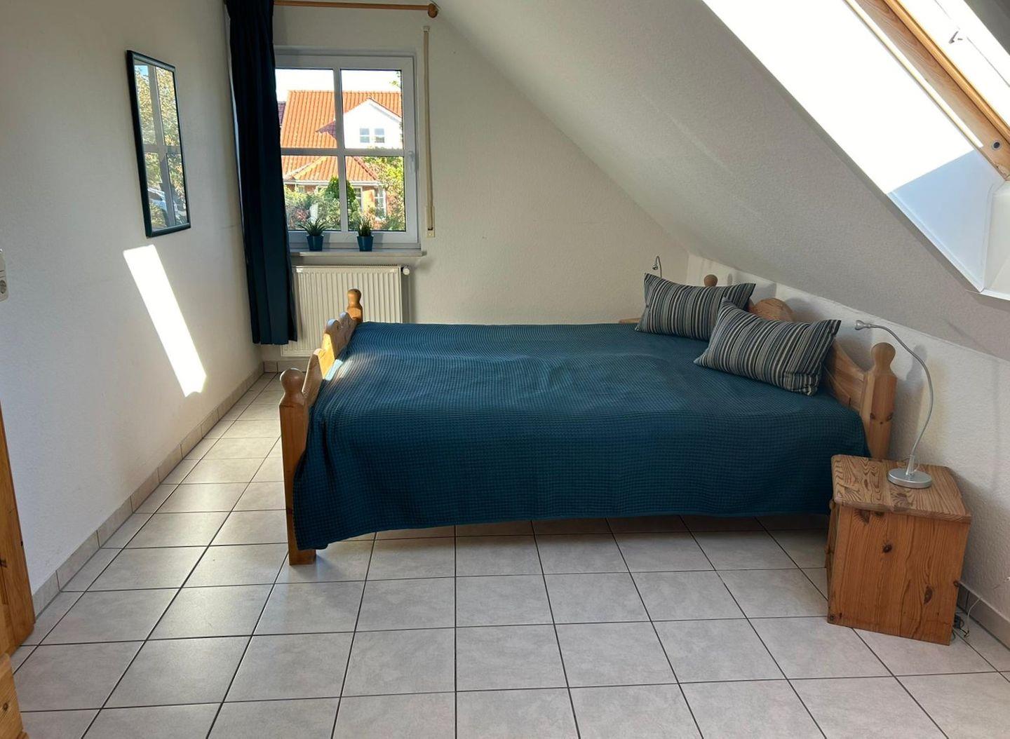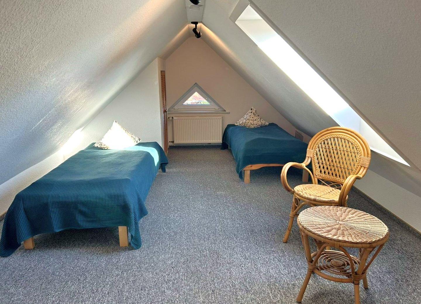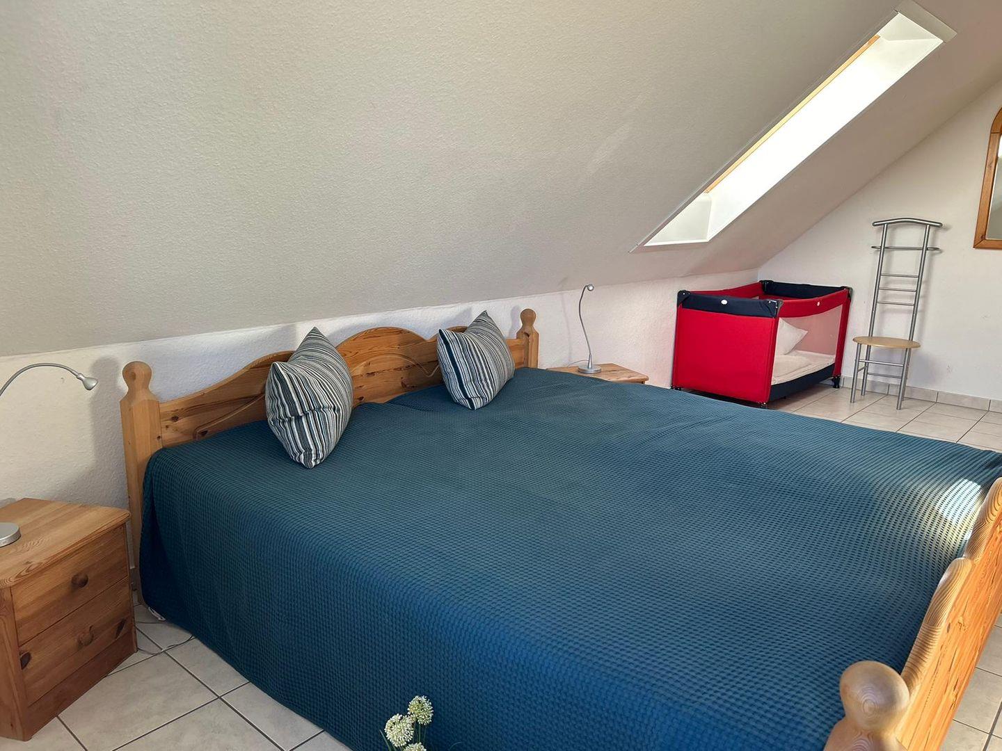 Im Schlafzimmer befindet sich ein Doppelbett (180x200m). Zwei weitere Einzelbetten bieten einen Schlafplatz unter dem Dach. Bettwäsche und Handtücher können hinzugebucht werden.