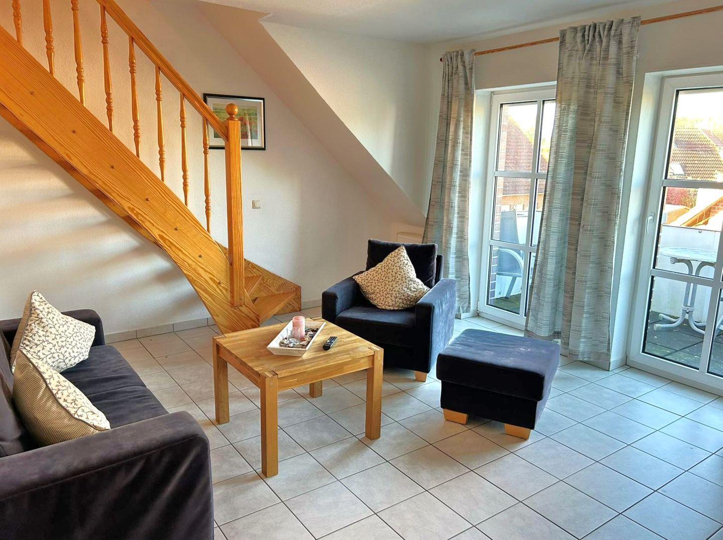 Die Ferienwohnung mit einem seperatem Eingang befindet sich im Obergeschoss eines Doppelhauses und hat einen Balkon zum Entspannen nach einem langen Strandtag. Fahrräder können Sie im abschließbaren Schuppen abstellen.