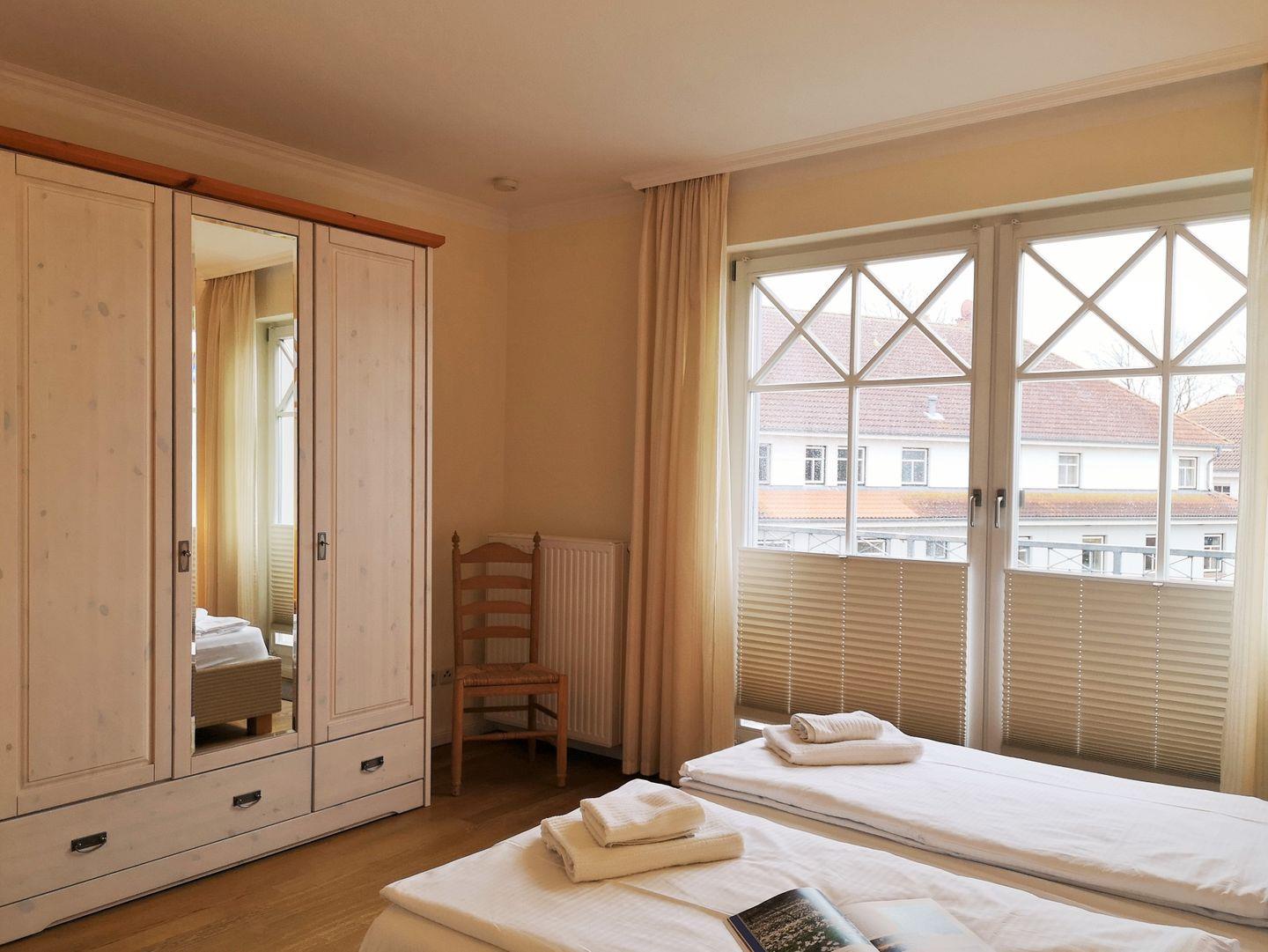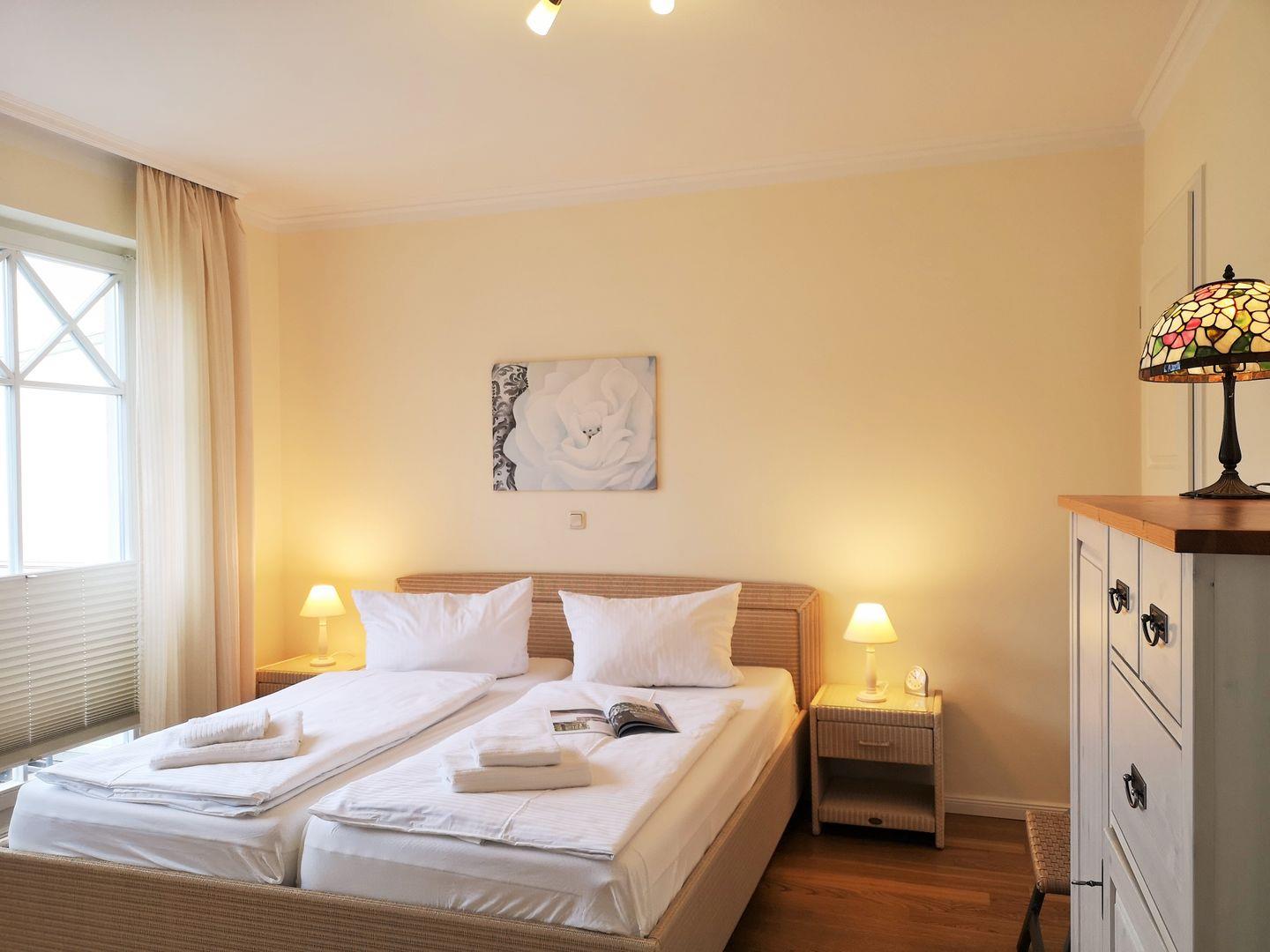 Das freundliche und sehr gemütliche Schlafzimmer ist mit einem bequemen Doppelbett, Nachttischen sowie einem geräumigen Kleiderschrank eingerichtet. Vom Schlafzimmer haben Sie ebenfalls direkten Zugang zum großen Sonnenbalkon.