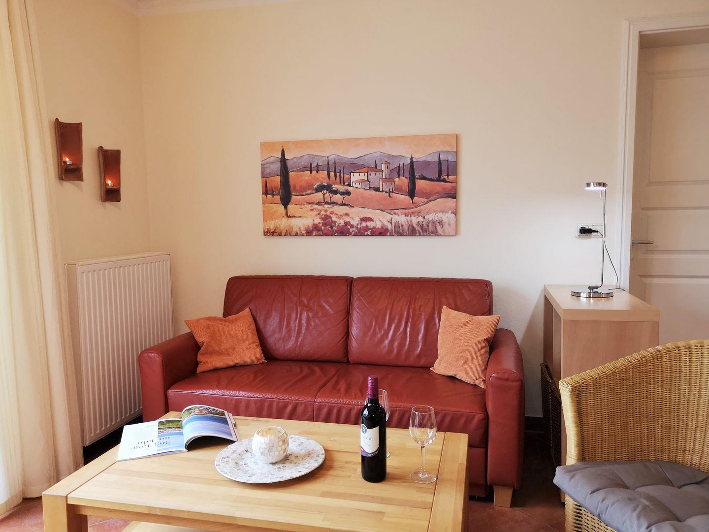 Eine zusätzliche bequeme Schlafmöglichkeit für weitere 2 Personen bietet die ausziehbare Schlafcouch im Wohnzimmer.