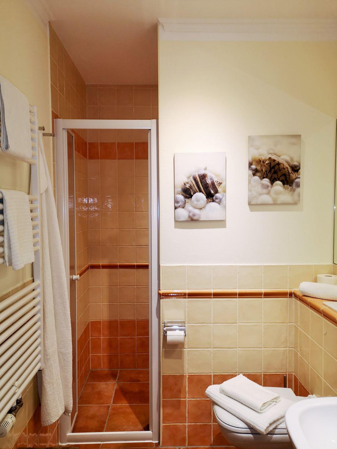 Das mediterran anmutende Badezimmer verfügt über eine Dusche mit (senioren-freundlichem!) niedrigem Einstieg, Waschbecken, WC, Föhn, Kosmetikspiegel, einen Handtuch-Heizkörper sowie ausreichend Ablagemöglichkeiten.