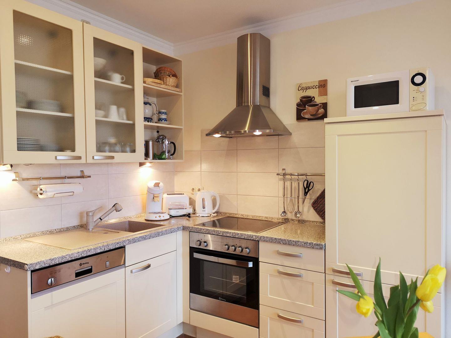 Die offene Küche beinhaltet eine voll ausgestattete Einbauküchenzeile in gehobener Ausstattung mit 4-Platten-Ceran-Kochfeld, Backofen, Dunstabzug, Mikrowelle, Kühlschrank mit Gefrierfach, Geschirrspülmaschine, Kaffeemaschine, SENSEO-Kaffeeautomat, Wasserkocher und Toaster. Die Küche ist mit Geschirr, Gläsern, Besteck und Töpfen bestens und ausreichend ausgestattet.