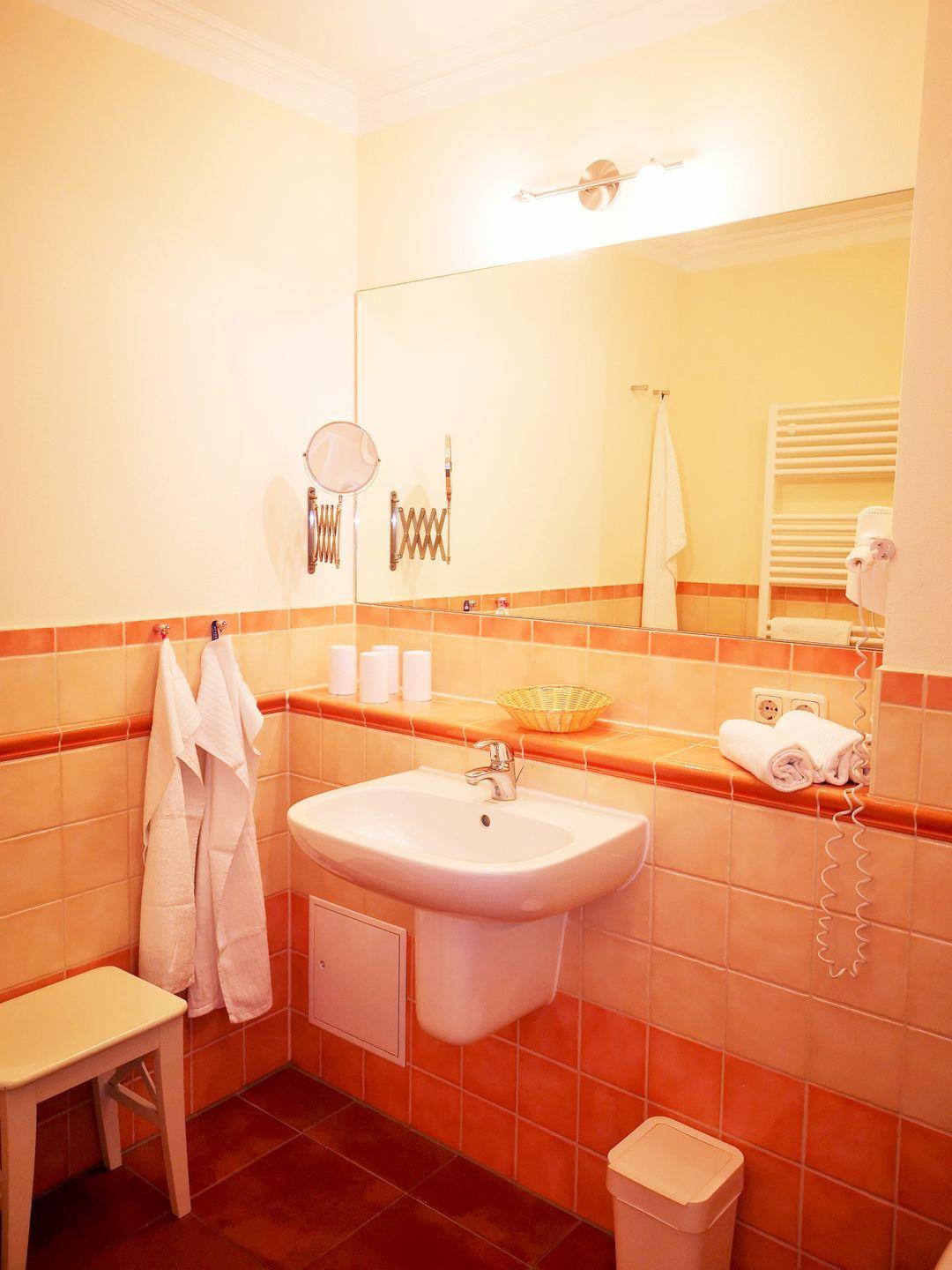 Das mediterran anmutende Badezimmer verfügt über eine Dusche mit (senioren-freundlichem!) niedrigem Einstieg, Waschbecken, WC, Föhn, Kosmetikspiegel, einen Handtuch-Heizkörper sowie ausreichend Ablagemöglichkeiten.