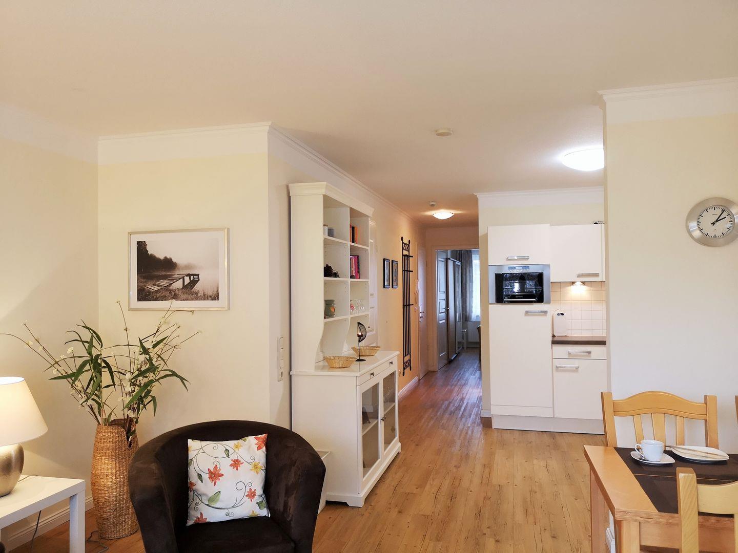 Die offene Wohnküche beinhaltet eine voll ausgestattete Einbauküchenzeile in gehobener Ausstattung mit 4-Platten-Ceran-Kochfeld, Backofen, Dunstabzug, Mikrowelle, Kühlschrank mit Gefrierfach, Geschirrspülmaschine, Kaffeemaschine, Wasserkocher und Toaster. Die Küche ist mit Geschirr, Gläsern, Besteck und Töpfen bestens und ausreichend ausgestattet.