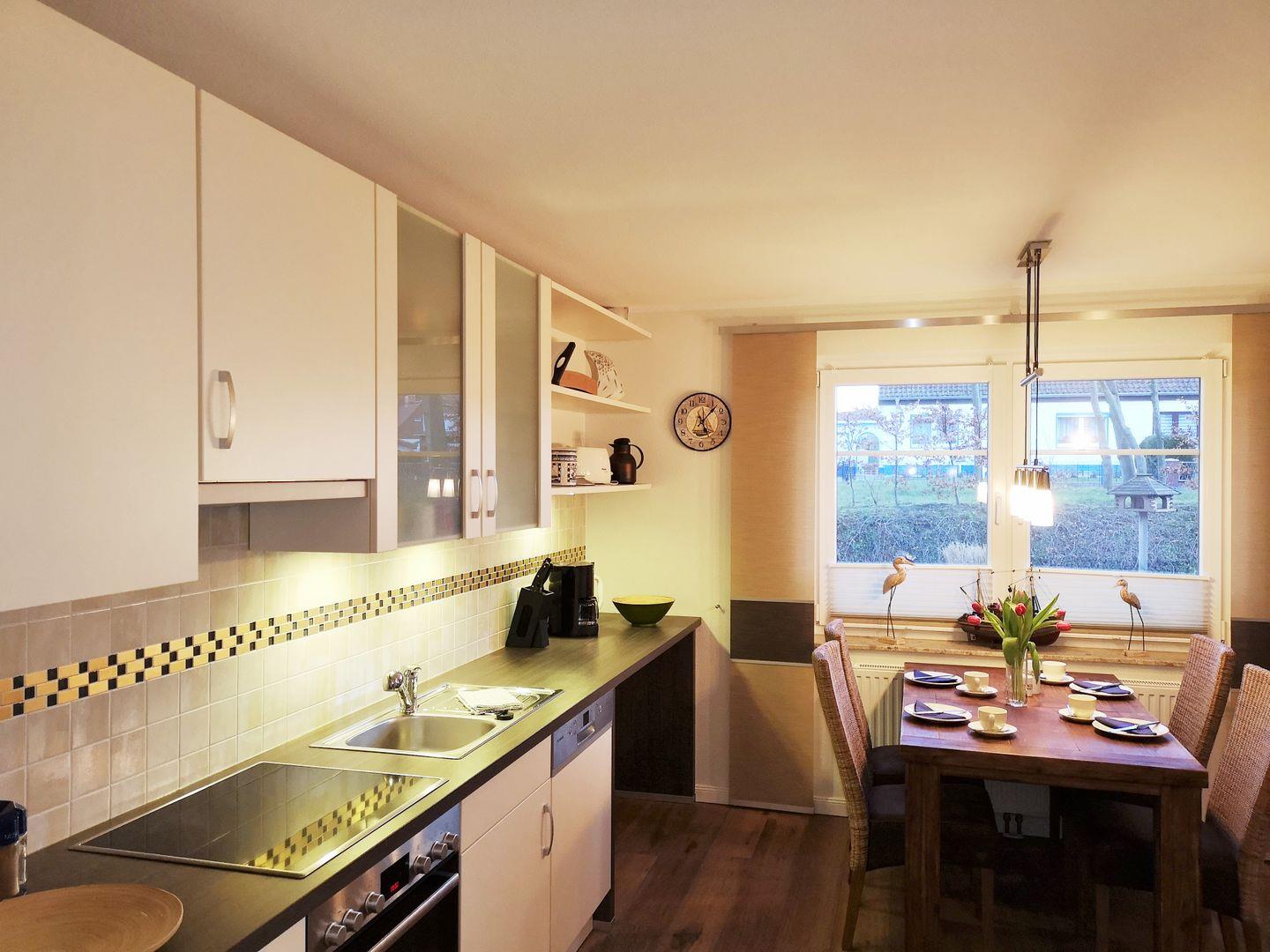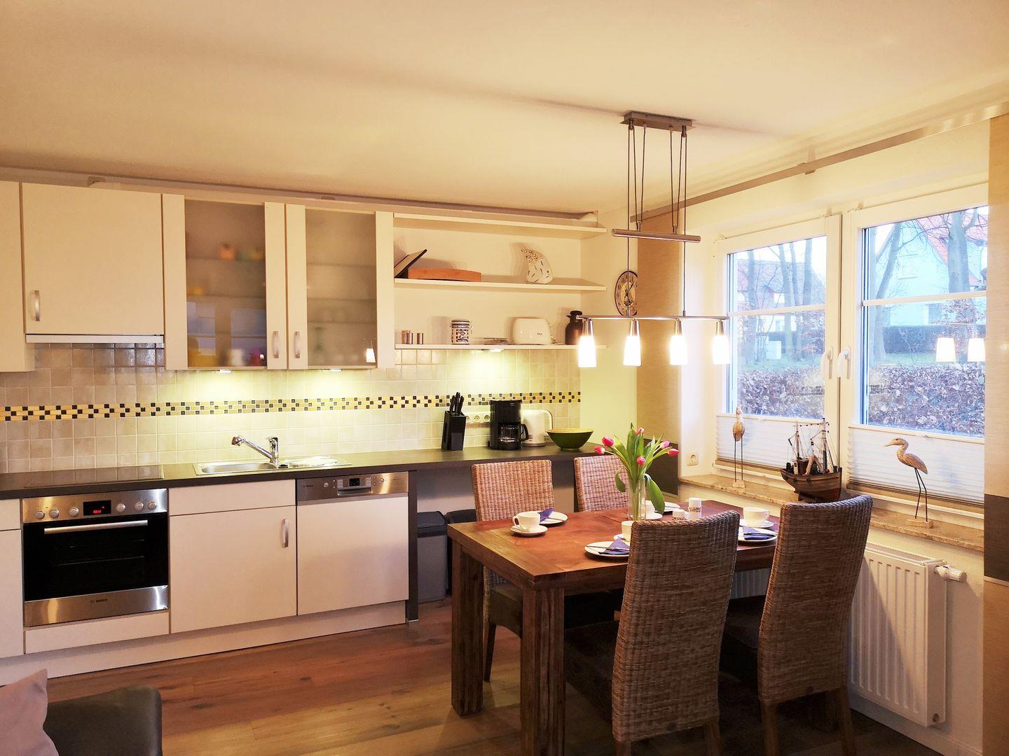 Die Küche beinhaltet eine voll ausgestattete Einbauküchenzeile mit 4-Platten-Ceran-Kochfeld, Backofen, Dunstabzug, Kühlschrank mit Gefrierfach, Geschirrspülmaschine, Kaffeemaschine, Wasserkocher und Toaster. Die Küche ist mit Geschirr, Gläsern, Besteck und Töpfen bestens und ausreichend ausgestattet.