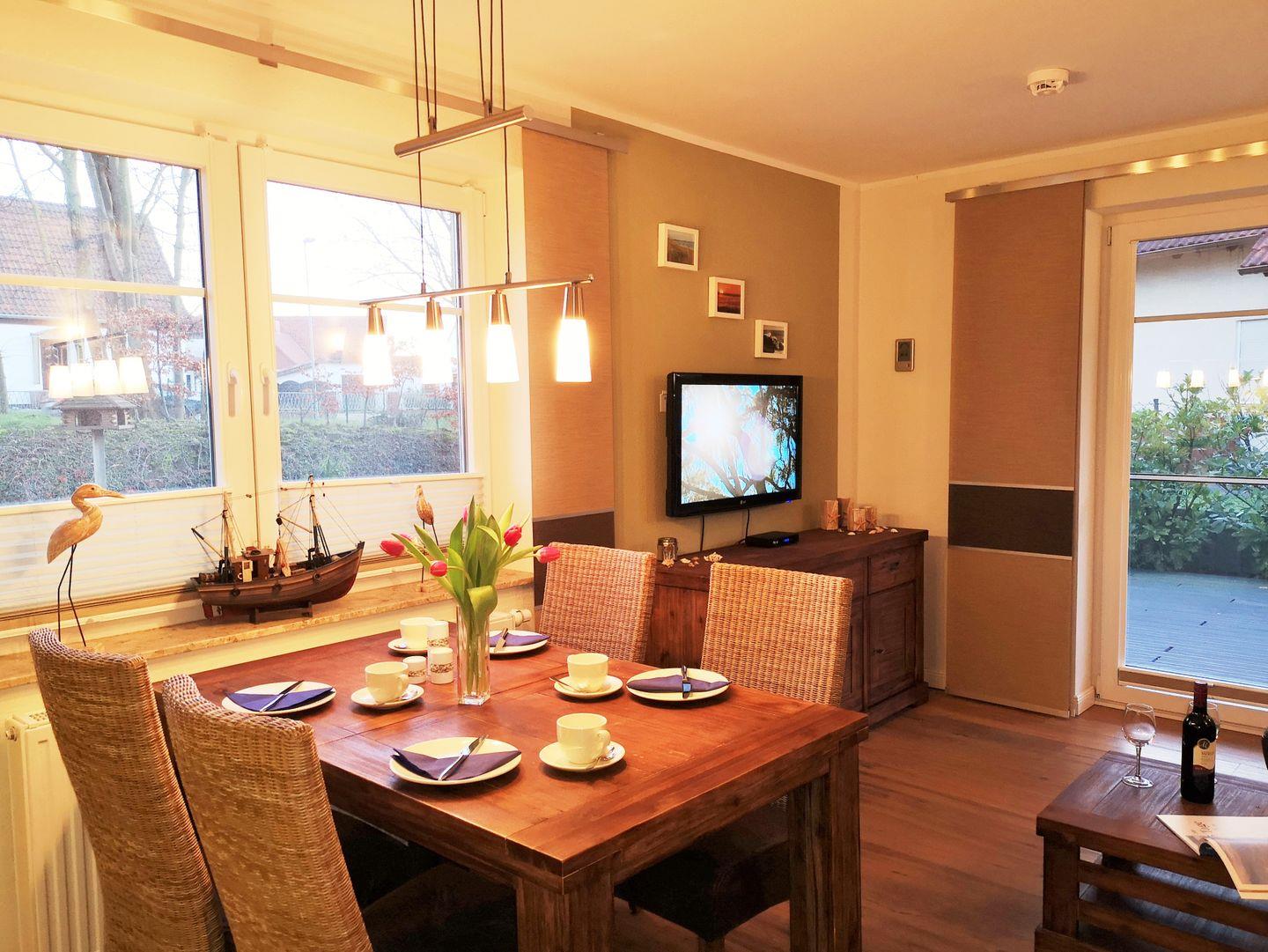 Das geräumige und modern eingerichtete Wohn-/Esszimmer verfügt über eine separate Sitzgruppe mit bequemer Eckcouch und Couchtisch, einen separaten Esstisch mit 4 Stühlen sowie ein Sideboard. Vom Wohnzimmer aus haben Sie direkten Zugang zu der ca. 20 m² großen, sonnigen sowie teilweise überdachten Terrasse (nach Süden und Westen ausgerichtet) mit bequemen Terrassenmöbeln und kleinem Gartenanteil. Hier sitzen Sie entspannt und gemütlich im Grünen und können abends bei einem guten Glas Wein in Ruhe die lauen Sommernächte genießen!
