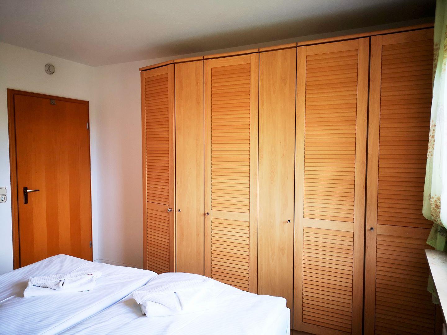 Das gemütliche und helle Schlafzimmer ist mit einem bequemen Boxspringbett, Nachttischen sowie einem sehr geräumigen Kleiderschrank eingerichtet.