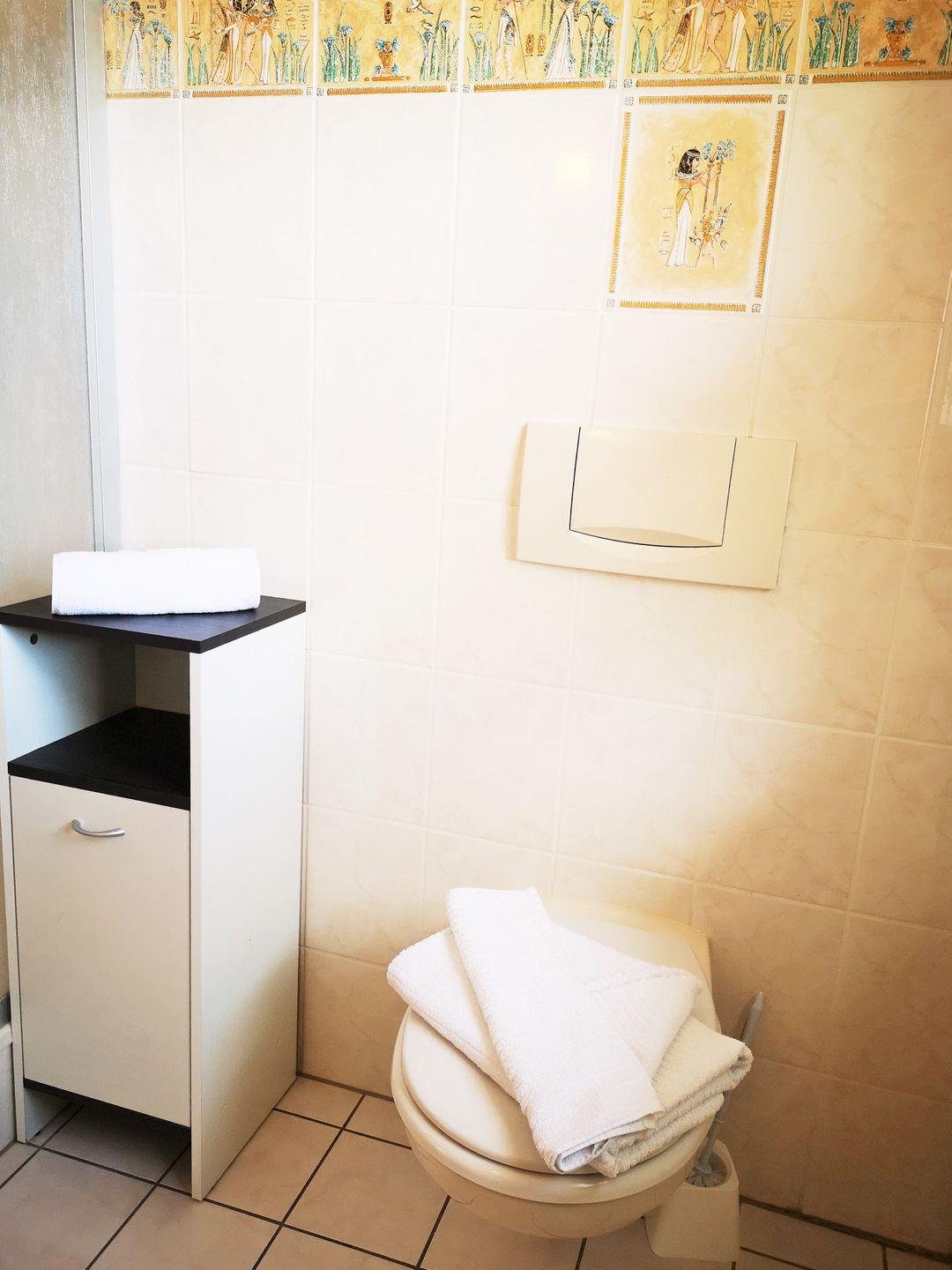 Das helle Badezimmer (mit Tageslicht / Fenster) verfügt über eine Dusche, Waschbecken und WC, einen kleinen Badezimmerschrank sowie ausreichend Ablagemöglichkeiten.