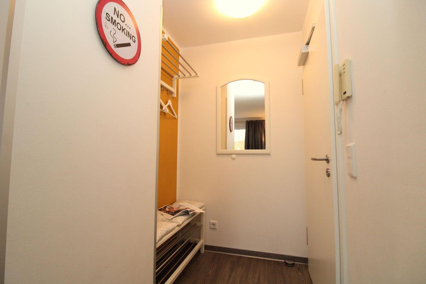 Ihre Schuhe und Jacken können Sie an der Garderobe (mit Spiegel) und Schuhablage im Eingangsbereich der Wohnung unterbringen.