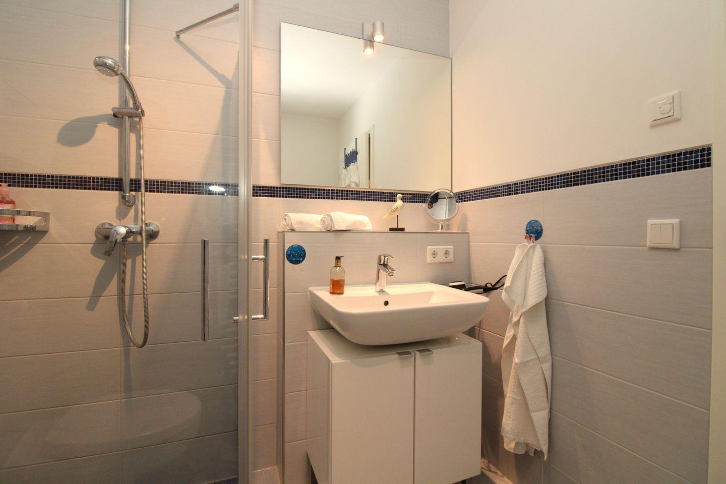 Das moderne Badezimmer verfügt über eine Dusche mit bodengleichem und seniorenfreundlichem Einstieg mit Echtglas-Duschtrennwand, Waschbecken und WC, einen Handtuch-Heizkörper, Föhn sowie ausreichend Ablagemöglichkeiten.