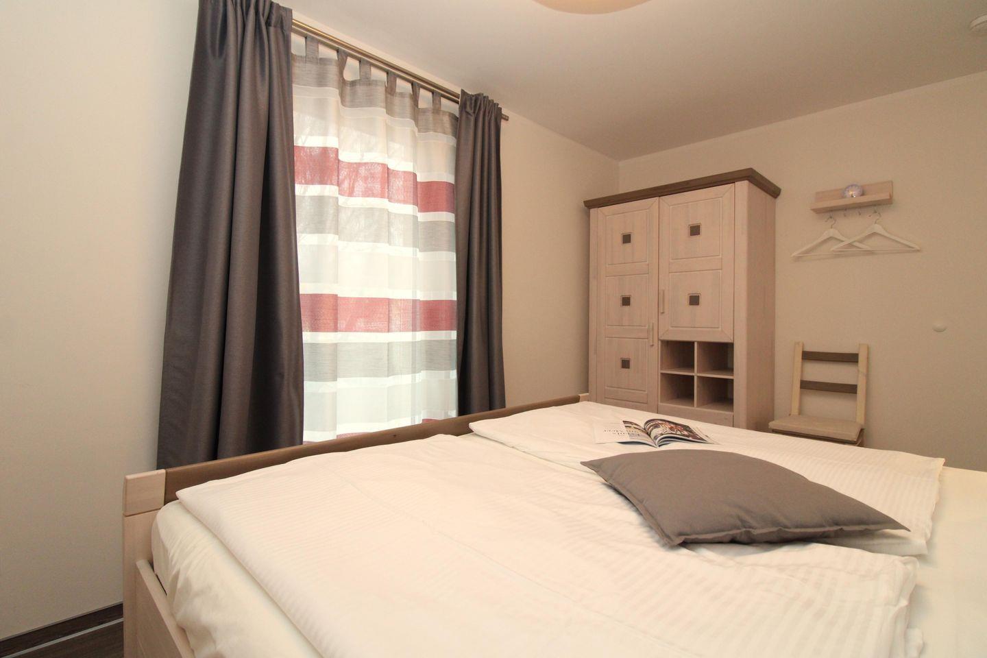 Das gemütliche 1. Schlafzimmer ist mit einem bequemen Doppelbett (2x90x200), Nachttischen sowie einem geräumigen Kleiderschrank eingerichtet.