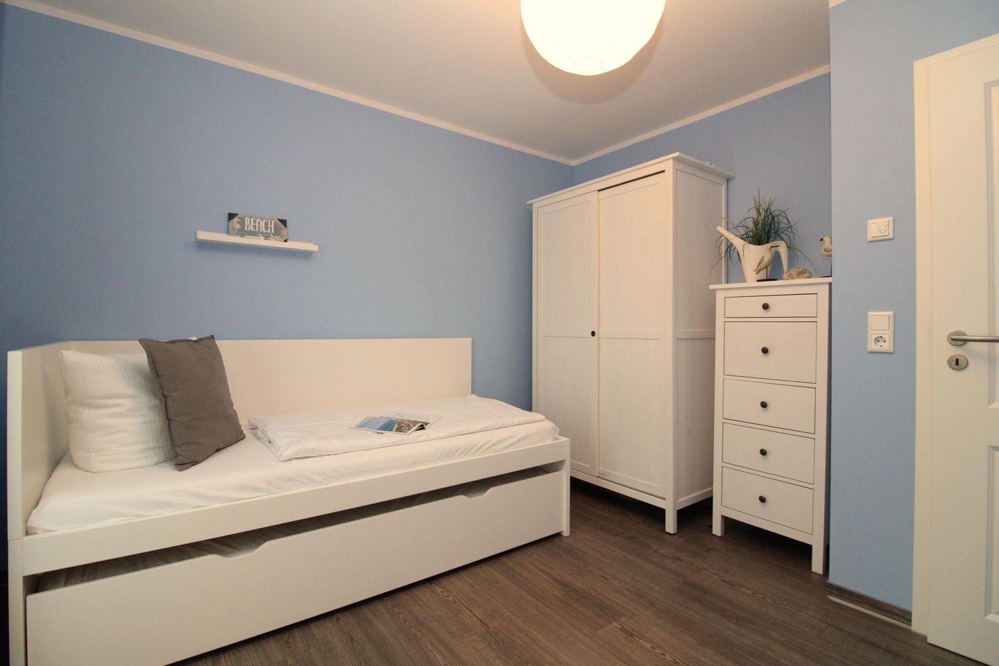 Das separate und freundliche 2. Schlafzimmer verfügt über ein bequemes und ausziehbares Einzelbett (90x200), Nachttisch sowie einen weiteren geräumigen Kleiderschrank