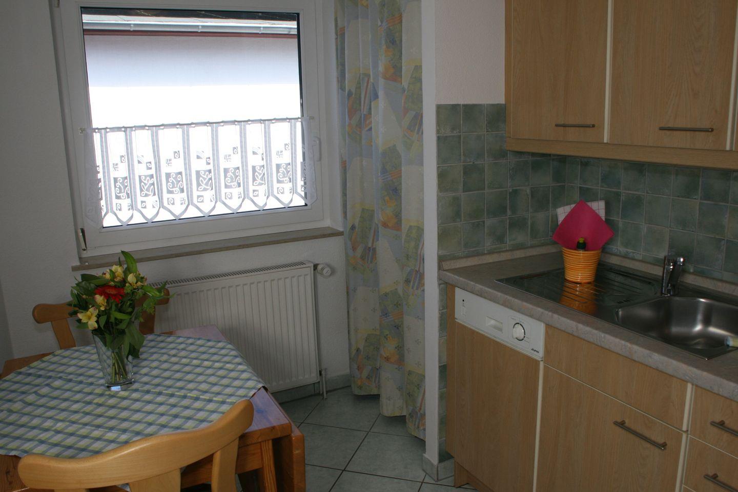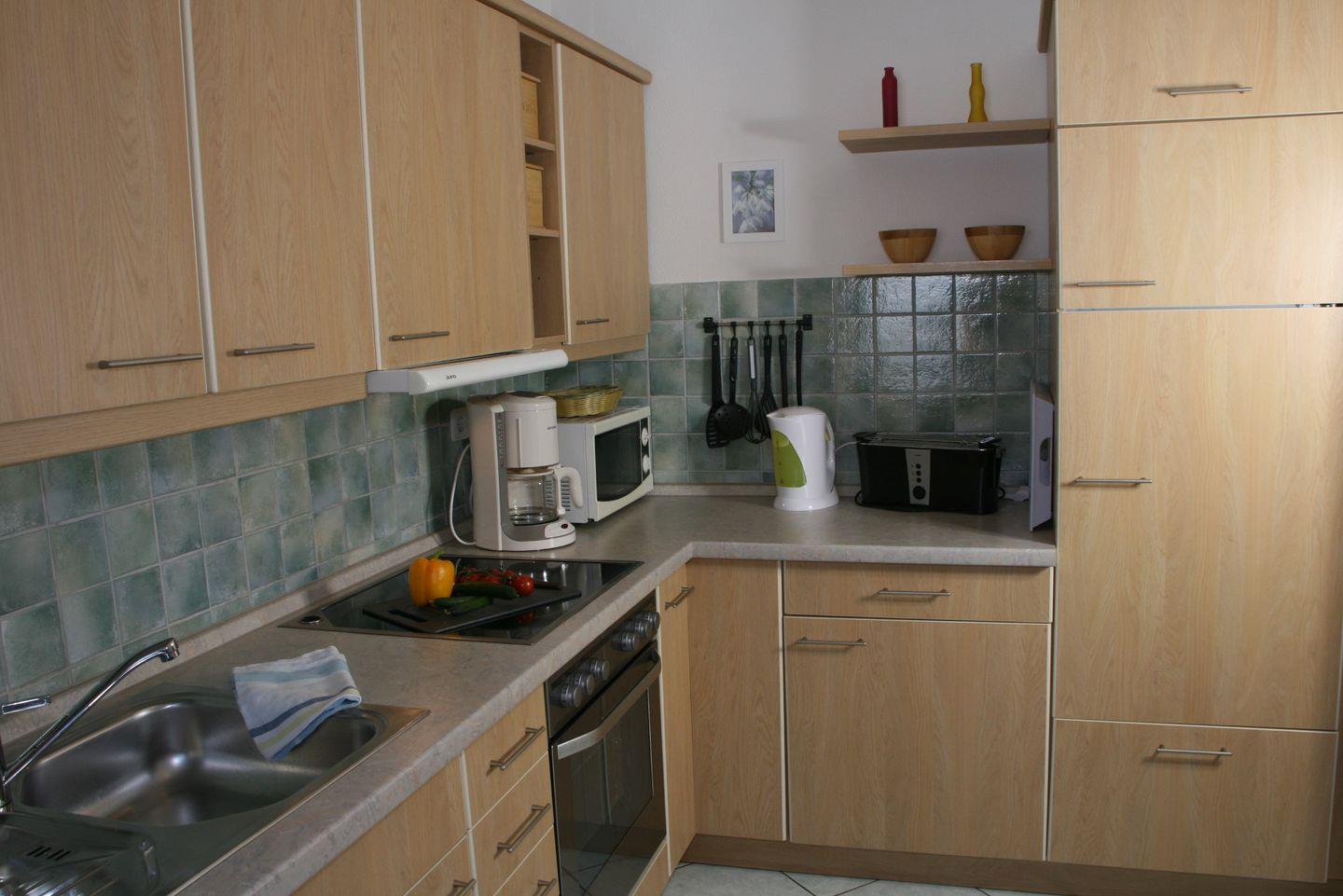 Die separate Küche ist mit Ceran-Kochfeld, Dunstabzug, Backofen, Mikrowelle, Kühlschrank mit Gefrierfach, Geschirrspüler, Kaffeemaschine, Toaster, Wasserkocher Geschirr und Kochgeschirr gut ausgestattet.