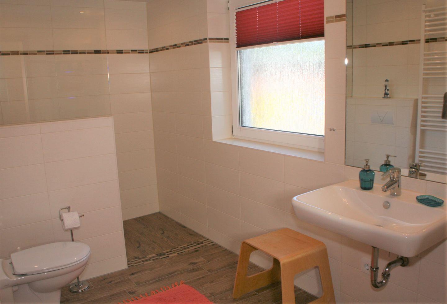 Das Hauptbadezimmer im Erdgeschoss hat eine großzügige befahrbare Dusche.