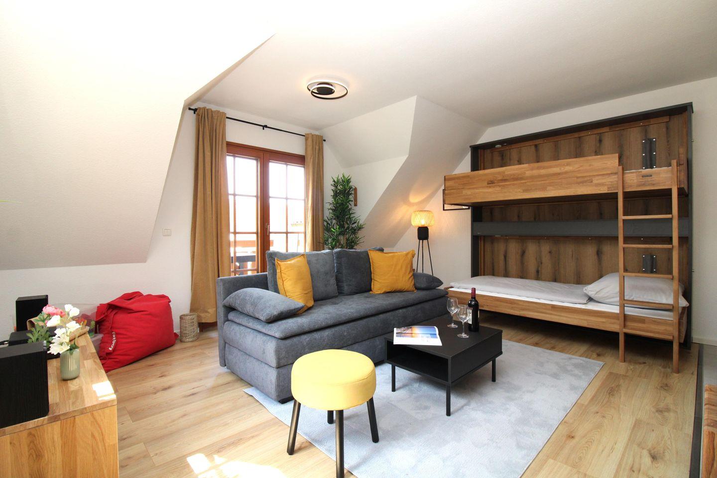 Zusätzliche bequeme Schlafmöglichkeiten für weitere 3. bis 6. Personen bieten die ausziehbare Schlafcouch (2 Pers.) bzw. ein ausklappbares Etagenbett (2 Einzelbetten) im Wohnzimmer.