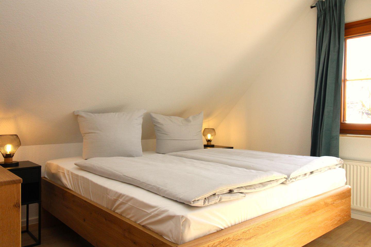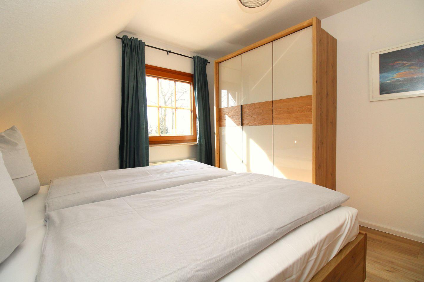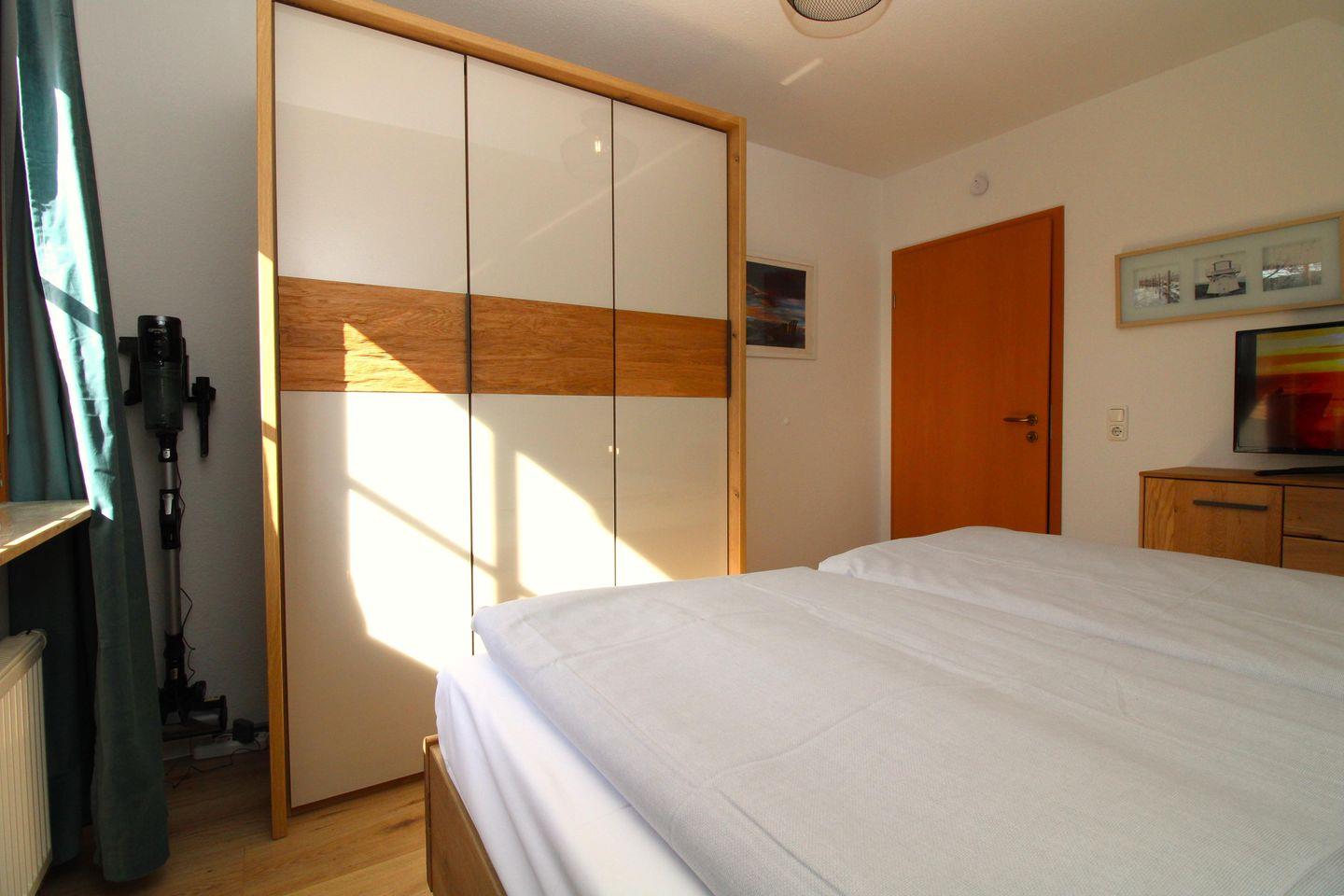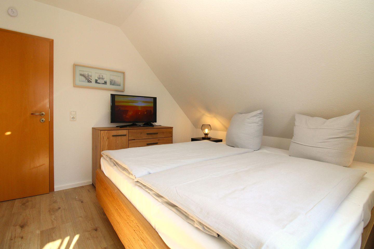 Das gemütliche Schlafzimmer ist mit einem bequemen Doppelbett (2 x 90 cm x 200 cm), Nachttischen mit Nachttischlampen, einem geräumigen Kleiderschrank sowie einer Kommode eingerichtet. Das Schlafzimmer verfügt ebenfalls über ein zusätzliches TV-Gerät.