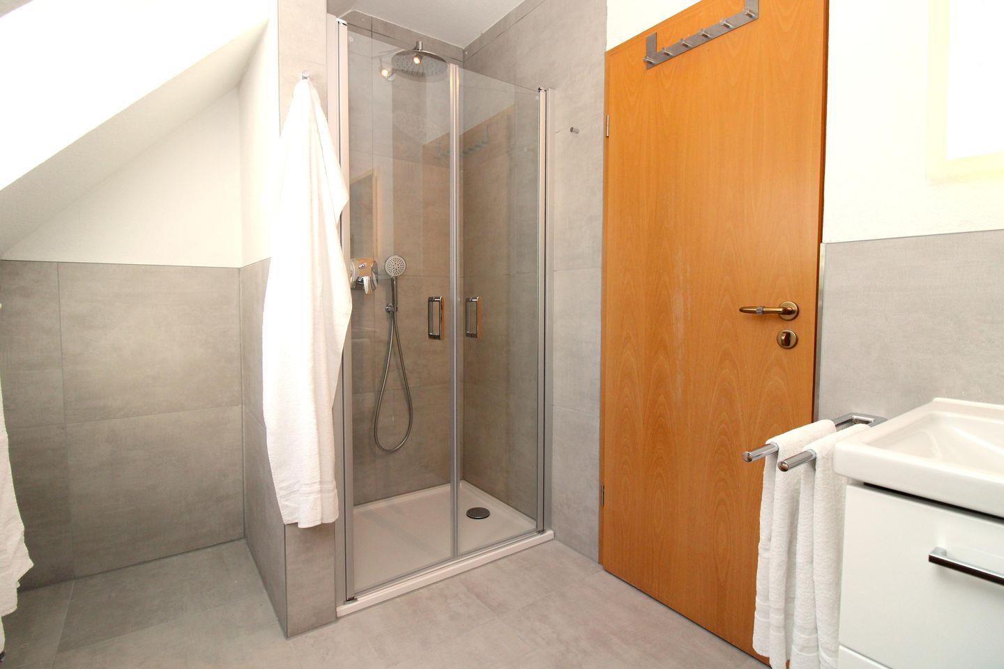 Das moderne Badezimmer (mit Tageslicht / Fenster) verfügt über eine Echtglas-Dusche mit bodentiefem Einstieg (seniorenfreundlich!), Waschbecken mit Unterschrank, WC, Kosmetikspiegel, Föhn, Handtuch-Heizkörper sowie ausreichend Ablagemöglichkeiten.